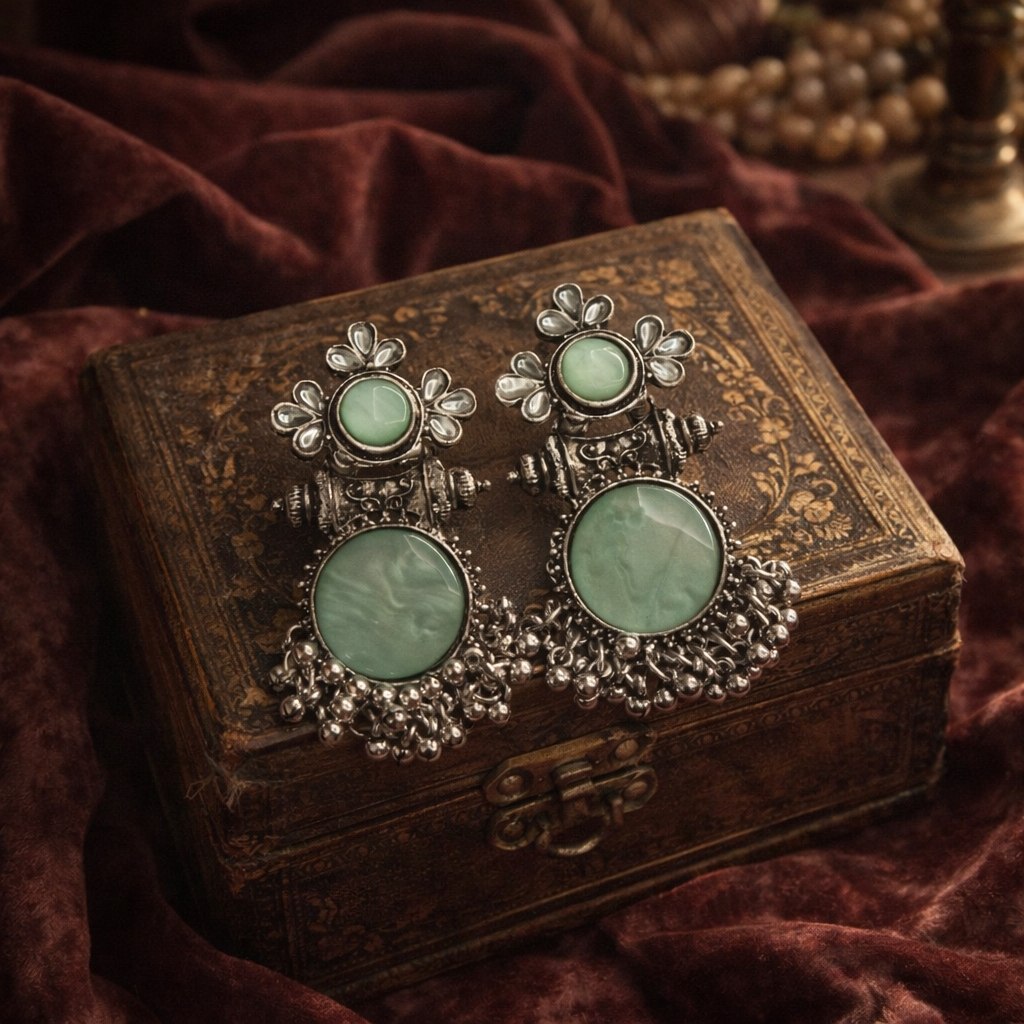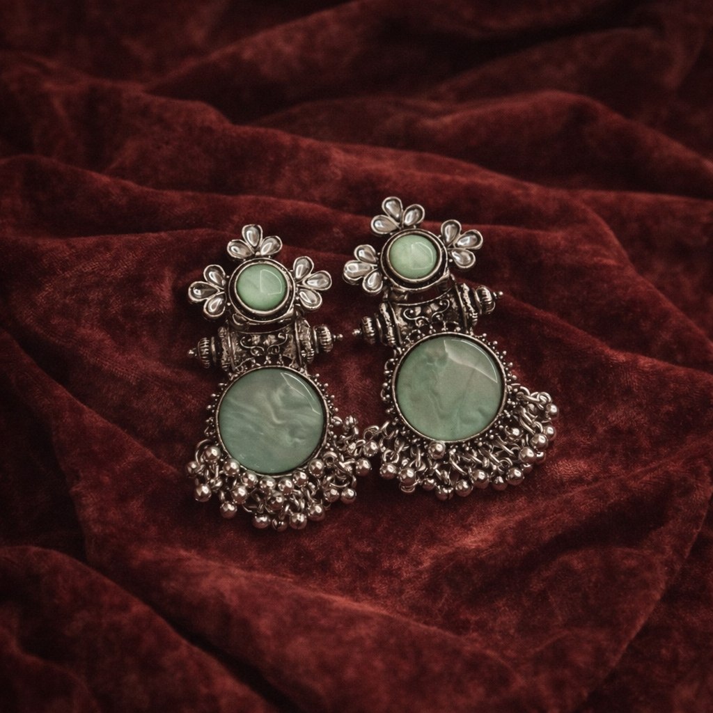 Make a bold style statement with these elegant antique oxidized silver earrings, beautifully crafted with a soothing green dual-stone design. The top features a delicate floral motif with a round green stone, while the larger circular stone below adds depth and visual appeal.