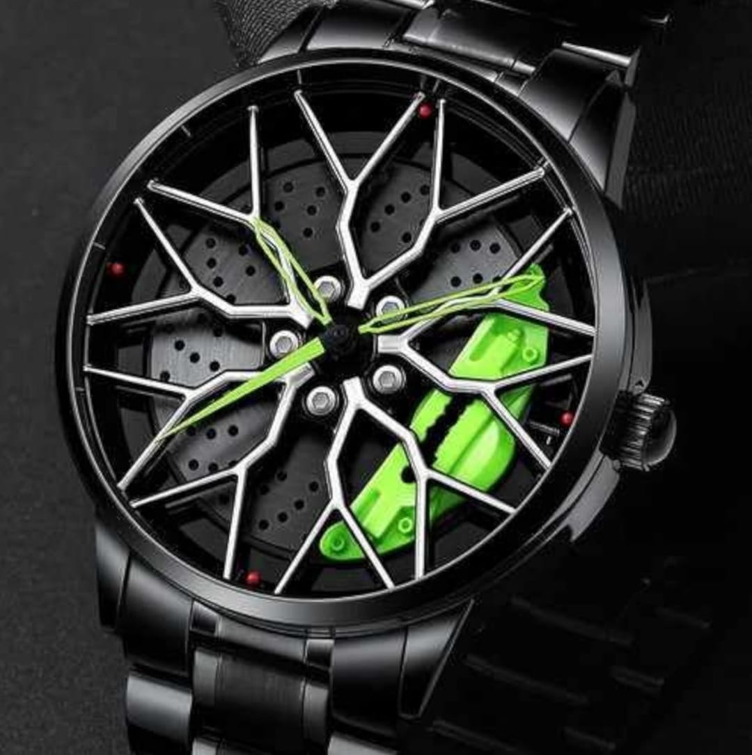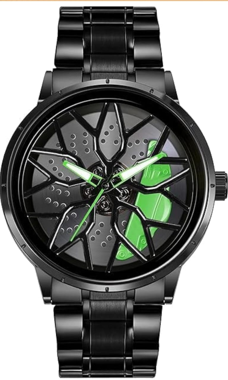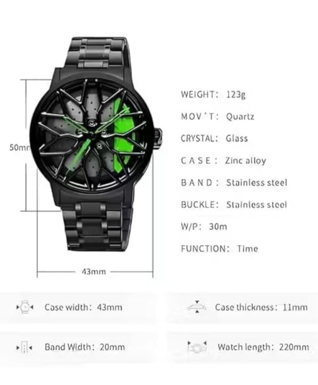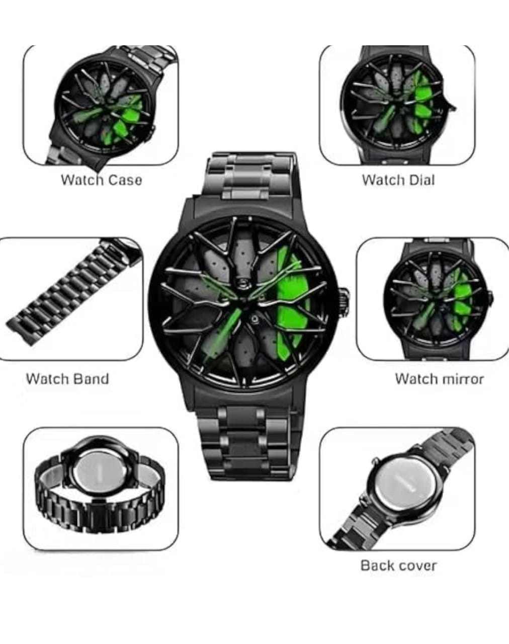 A stylish skeleton-design analog watch with a bold black metal strap and striking green accents inside the dial. Inspired by sports car wheel styling, it delivers a modern and premium look. Comfortable for daily wear and perfect for casual, party, and statement outfits. Durable build with an eye-catching design.