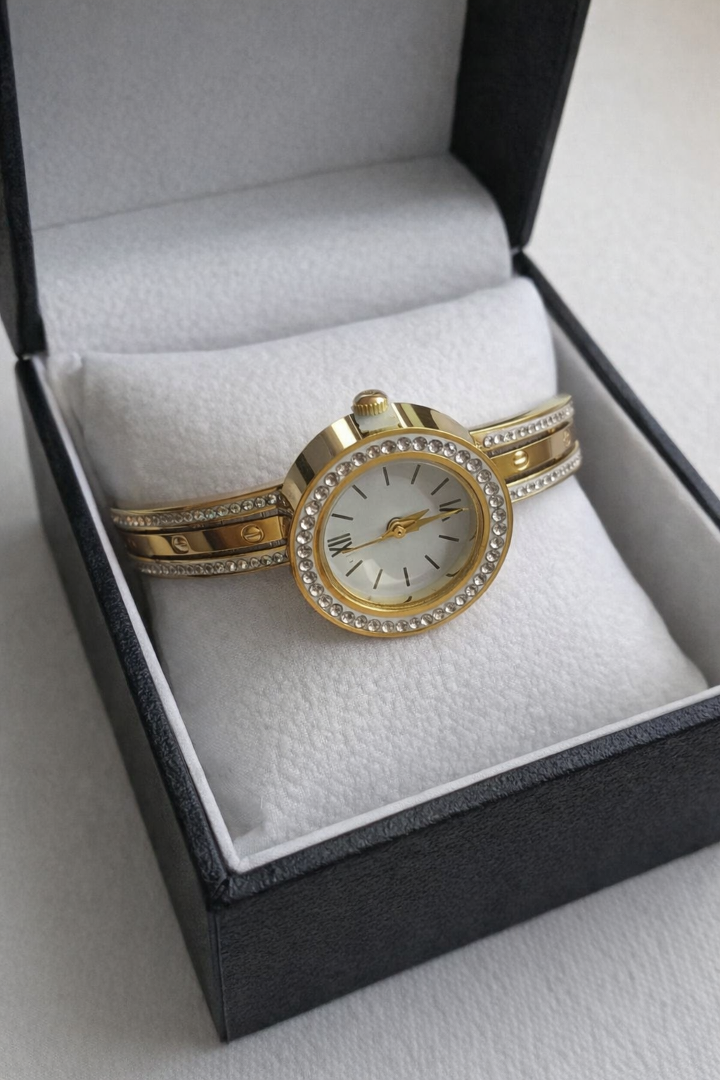 Add timeless elegance to your accessory collection with this classic gold-tone bracelet watch, designed for women who appreciate minimal yet luxurious style. The watch features a clean, sophisticated dial with sleek hour markers, surrounded by a sparkling crystal-studded bezel that enhances its refined appeal.