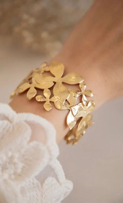 Add a touch of nature-inspired elegance to your look with this stunning gold leaf floral bracelet. Designed with intricately detailed leaves and delicate floral elements, this bracelet beautifully wraps around the wrist, creating a graceful and luxurious statement.