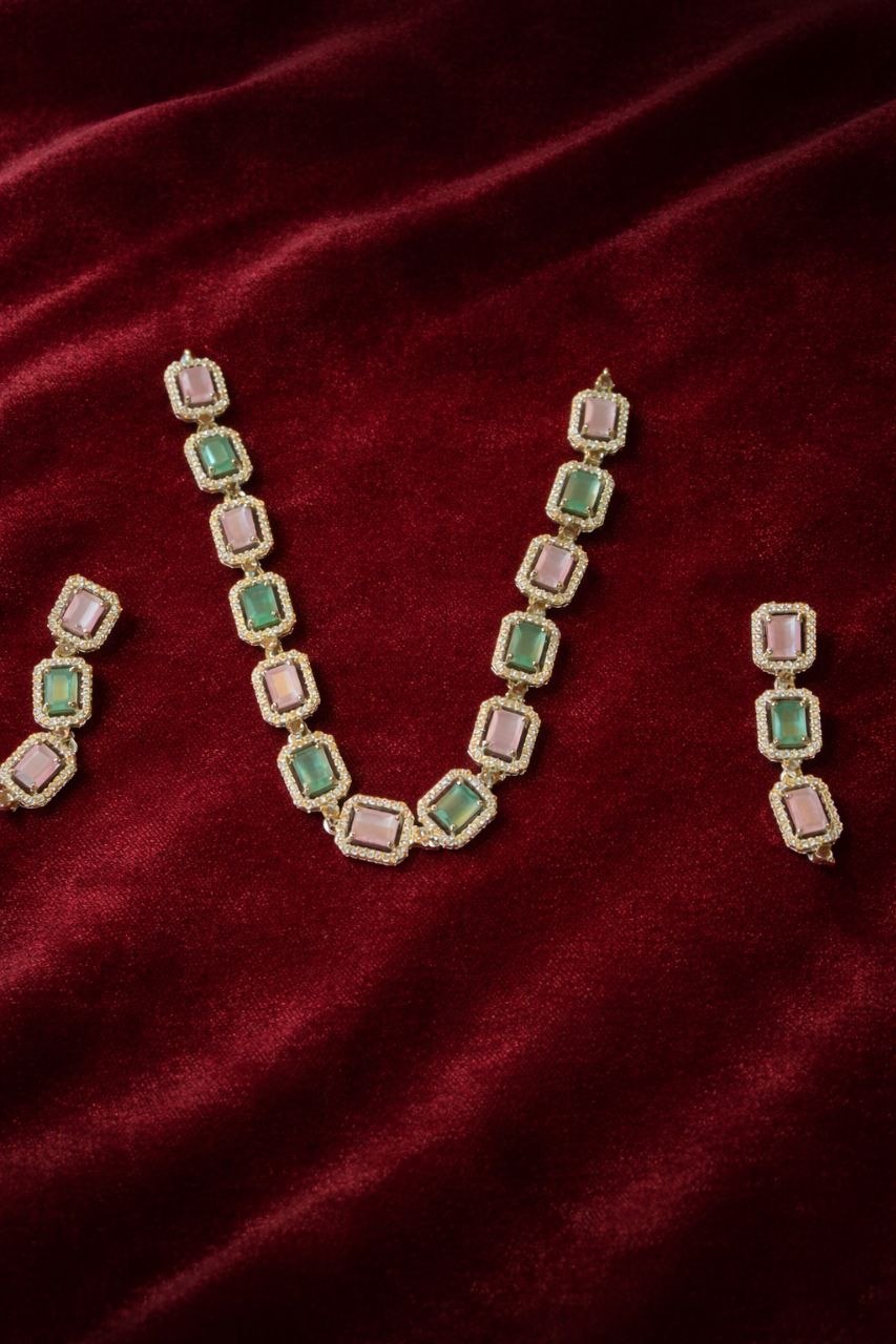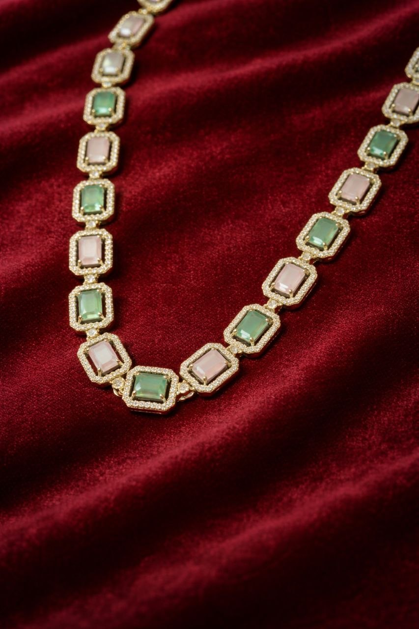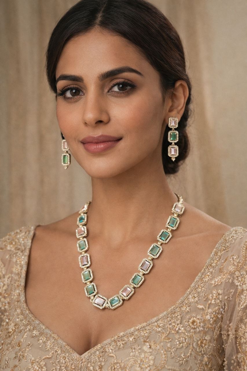 Add a touch of sophistication to your look with this beautifully crafted green stone and American diamond necklace set. Designed with a series of elegant rectangular green stones framed by sparkling diamonds, this necklace offers a perfect blend of modern style and classic charm.