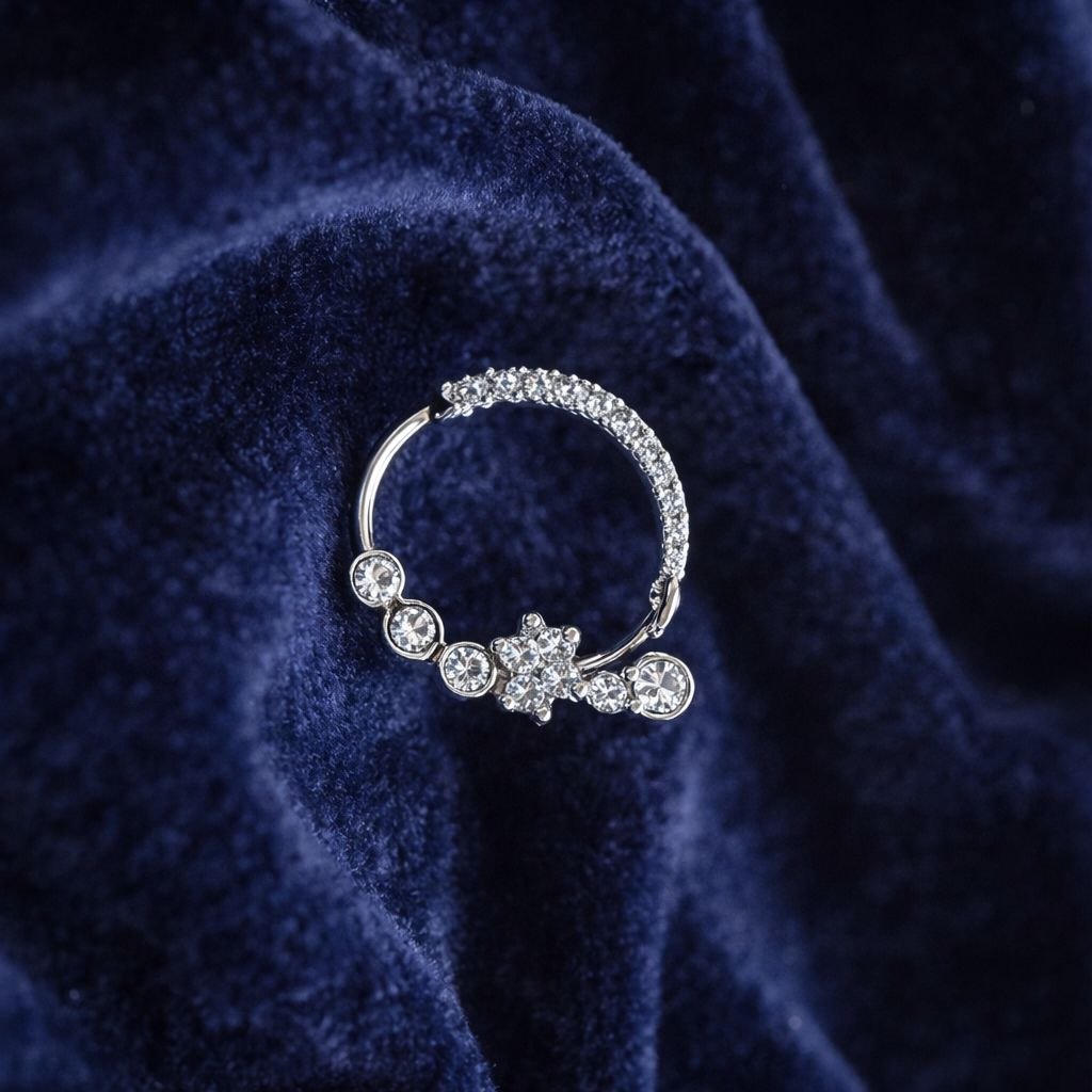 Add a delicate touch of elegance to your traditional look with this beautifully designed silver-plated nose ring (nath). Featuring a half-studded circular band with sparkling stones, this piece is highlighted by a charming floral cluster and round stone accents that enhance its graceful appeal.