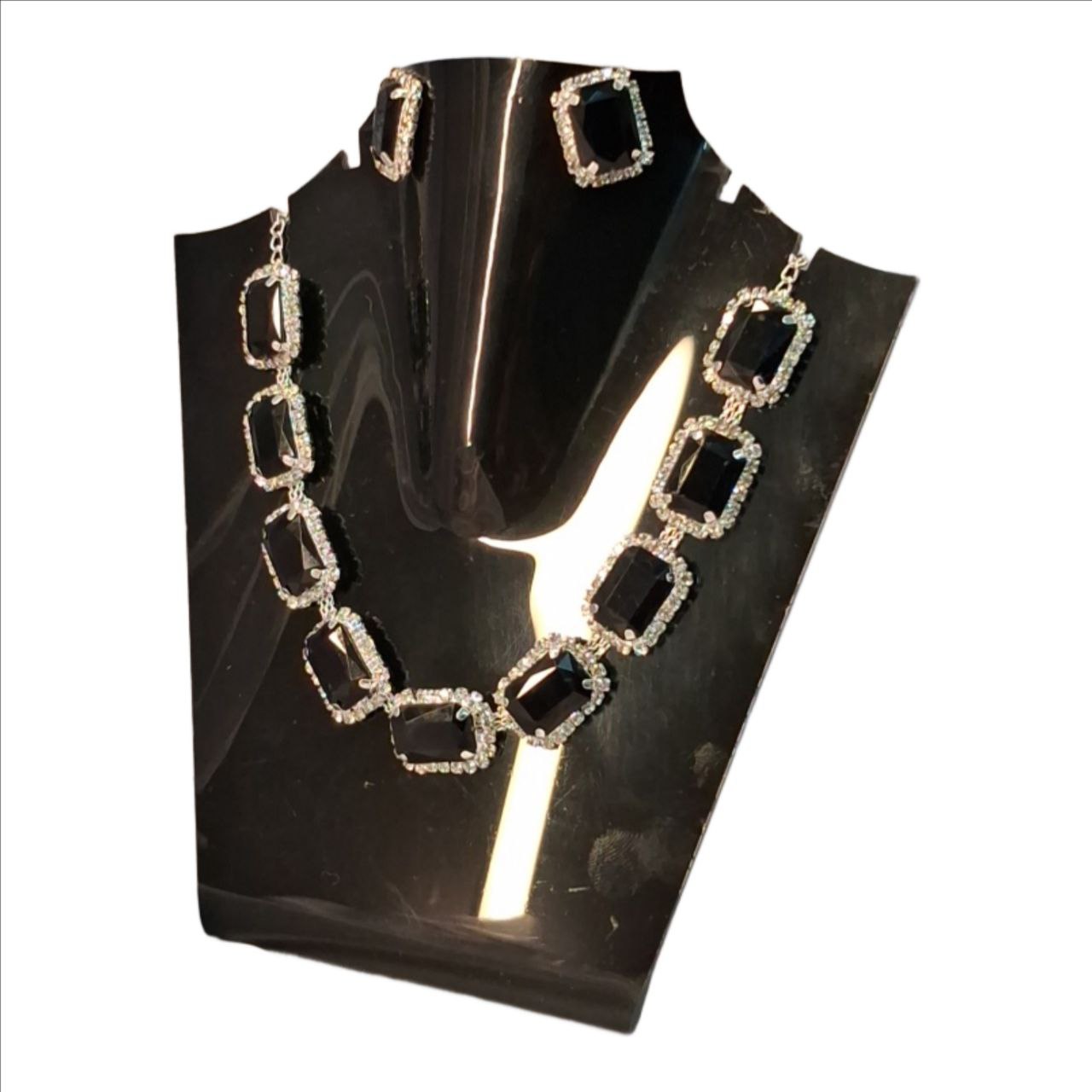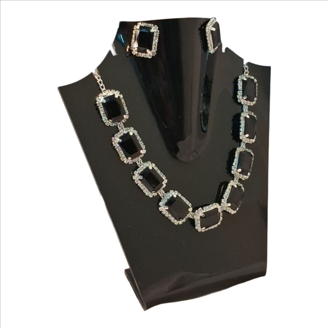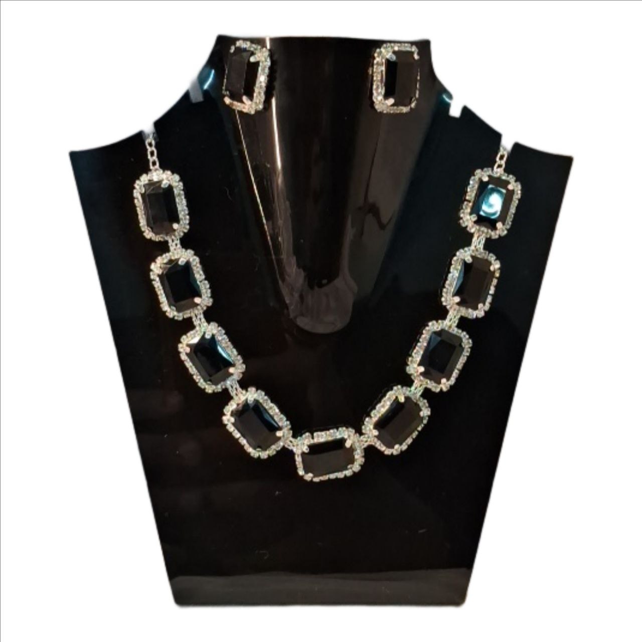 An elegant statement necklace set featuring emerald-cut black stones framed with sparkling crystals, paired with matching stud earrings. Perfect for evening wear, parties, and formal occasions, this set adds a bold yet classy touch to any outfit.