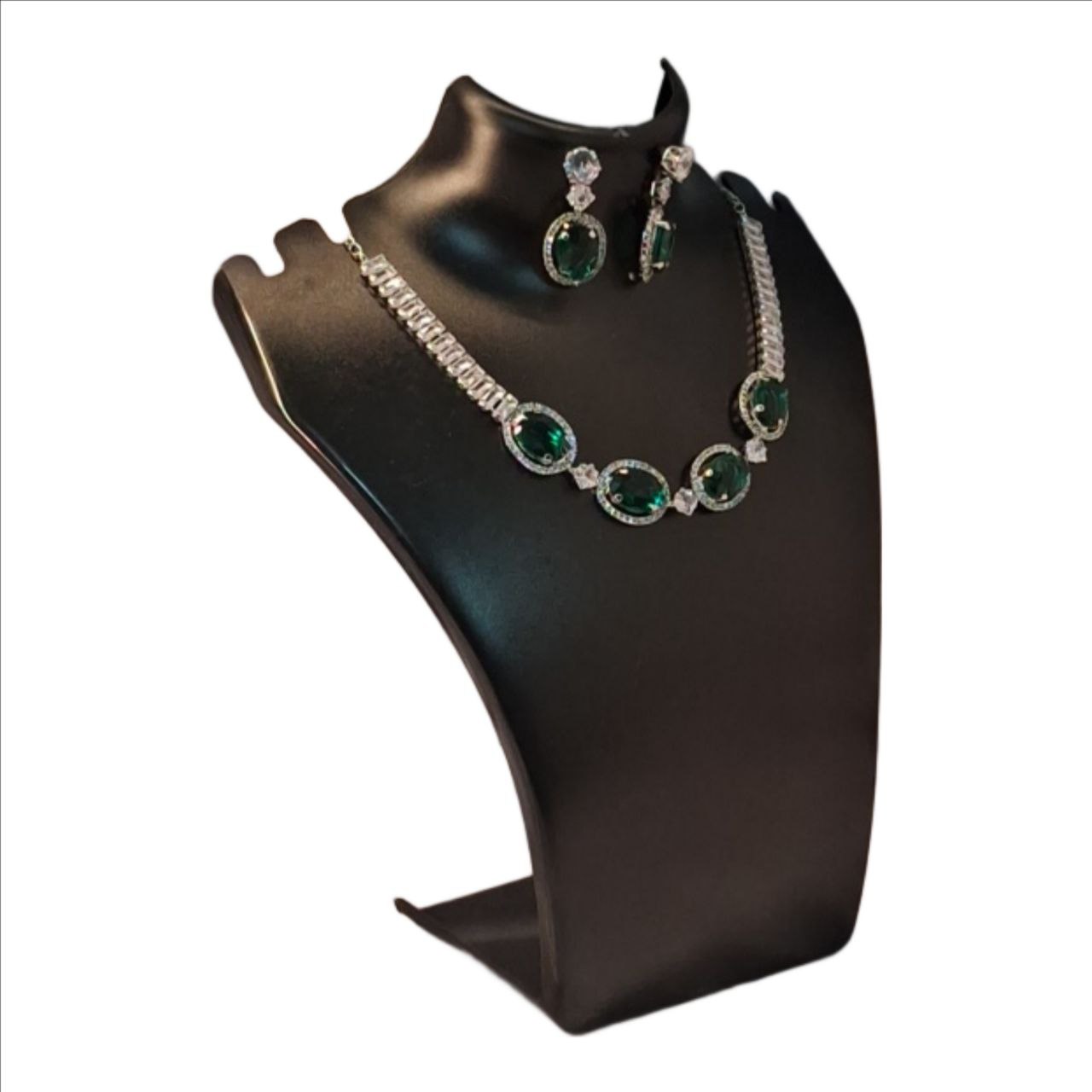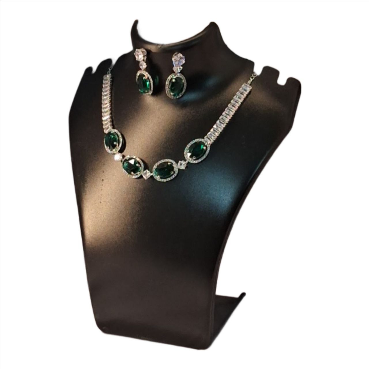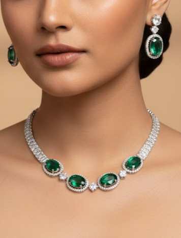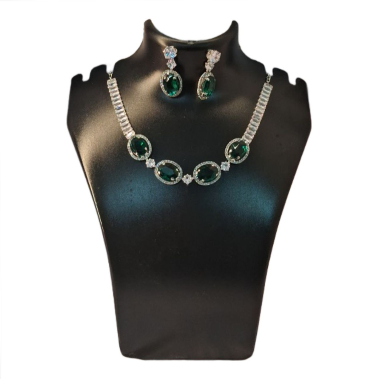 Make a refined style statement with this luxurious necklace and earring set featuring rich emerald-green stones framed with sparkling accents. The necklace showcases a graceful row of oval stones set in a sleek, polished design, perfectly complemented by matching drop earrings for a coordinated and sophisticated look.