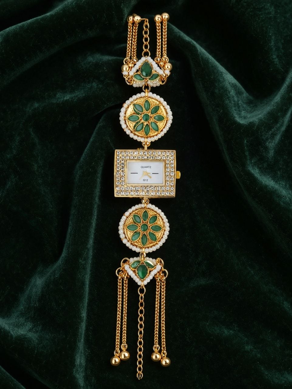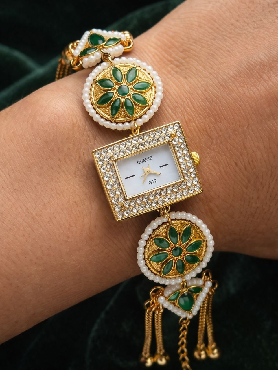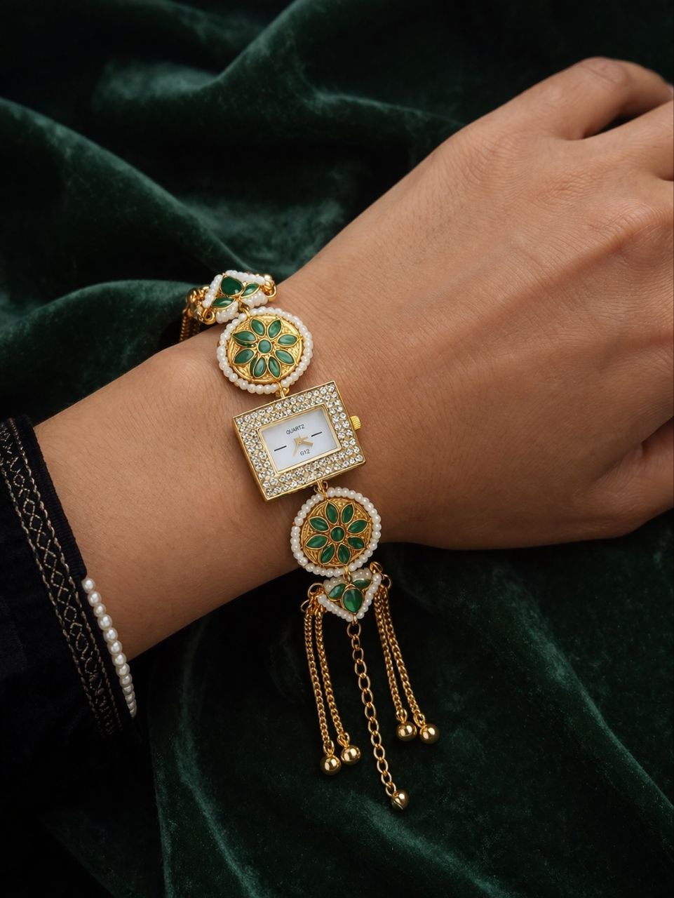 A statement of elegance and heritage, the Emerald Royale Charm Bracelet Watch blends the richness of traditional jewelry with modern sophistication. Designed with a unique rectangular dial framed in sparkling crystals, this watch is elevated by intricate circular motifs adorned with deep emerald-green accents and delicate pearl detailing.