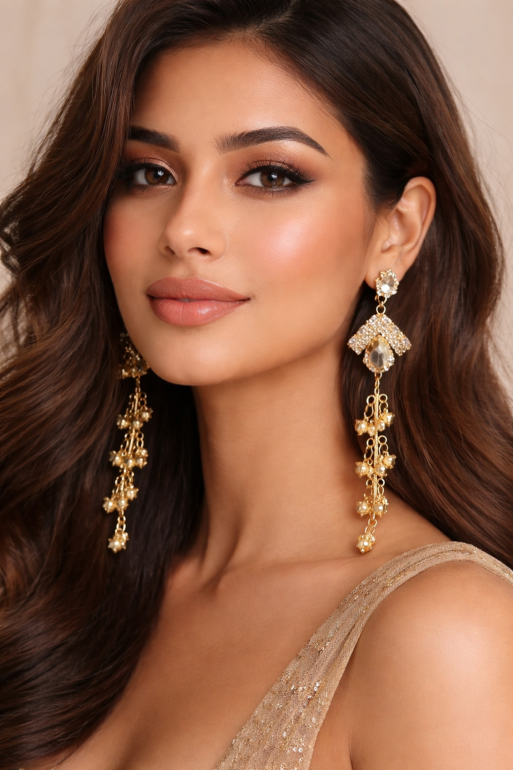 Elevate your style with these kashmiri-style gold-plated drop earrings, designed to add a graceful charm to any outfit. Featuring a sparkling crystal stud top, these earrings flow into a beautifully arranged geometric crystal design with a teardrop accent at the center. The long cascading chains adorned with delicate golden beads create a stunning tassel effect, adding movement and sophistication.