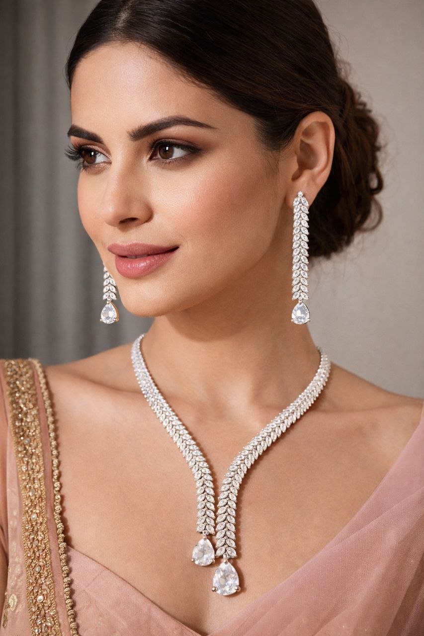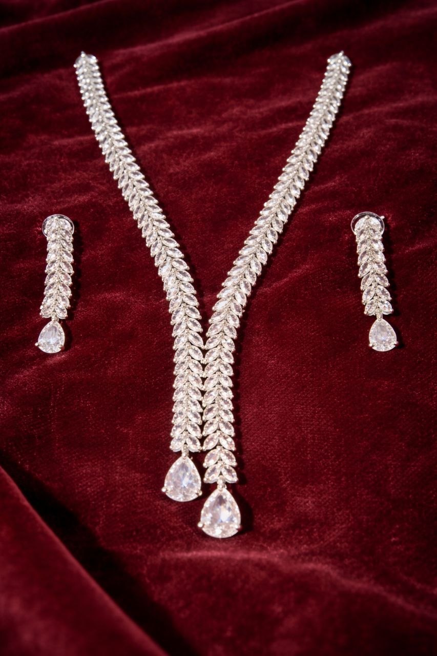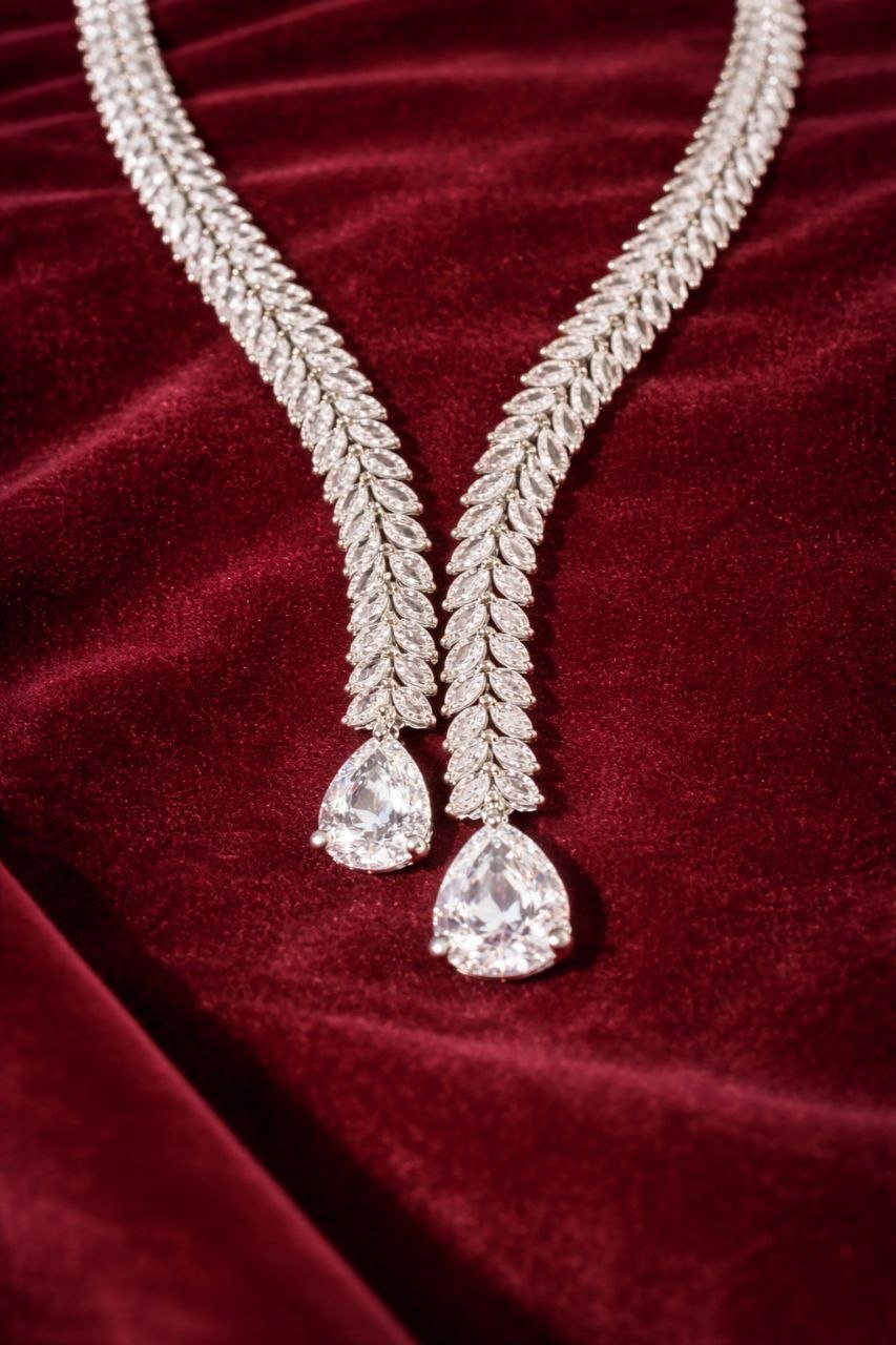 Elevate your style with this exquisite American diamond necklace set, designed to bring a perfect blend of elegance and sophistication. The necklace features a graceful layered pattern with finely set sparkling stones that converge into a stunning teardrop pendant, creating a luxurious and eye-catching finish.