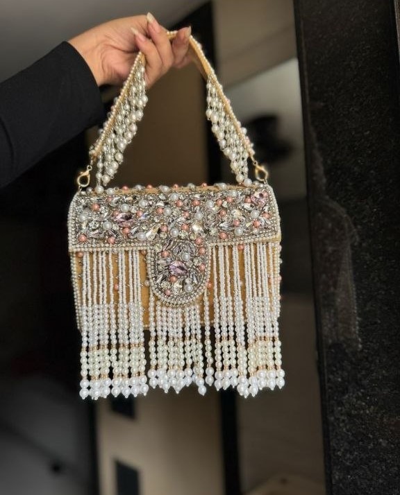 Add a touch of royal elegance to your look with this stunning pearl tassel embellished handbag. Designed with intricate crystal detailing, shimmering stone embellishments, and cascading pearl fringe, this statement bag is perfect for weddings, parties, festive occasions, and special events. Its ornate handcrafted design and premium finish make it an ideal accessory for ethnic and contemporary outfits alike. The embellished handle adds extra charm while ensuring easy carrying in style.