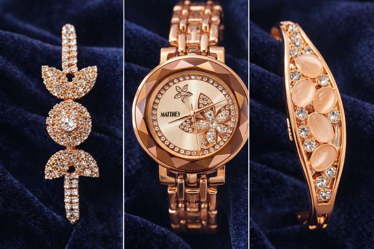 Upgrade your style with this elegant rose gold watch and bracelet combo set, designed to add a touch of luxury to your everyday and occasion wear. The set includes a beautifully crafted women’s wristwatch with a sparkling embellished dial, paired with two stylish bracelets featuring crystal and stone detailing.