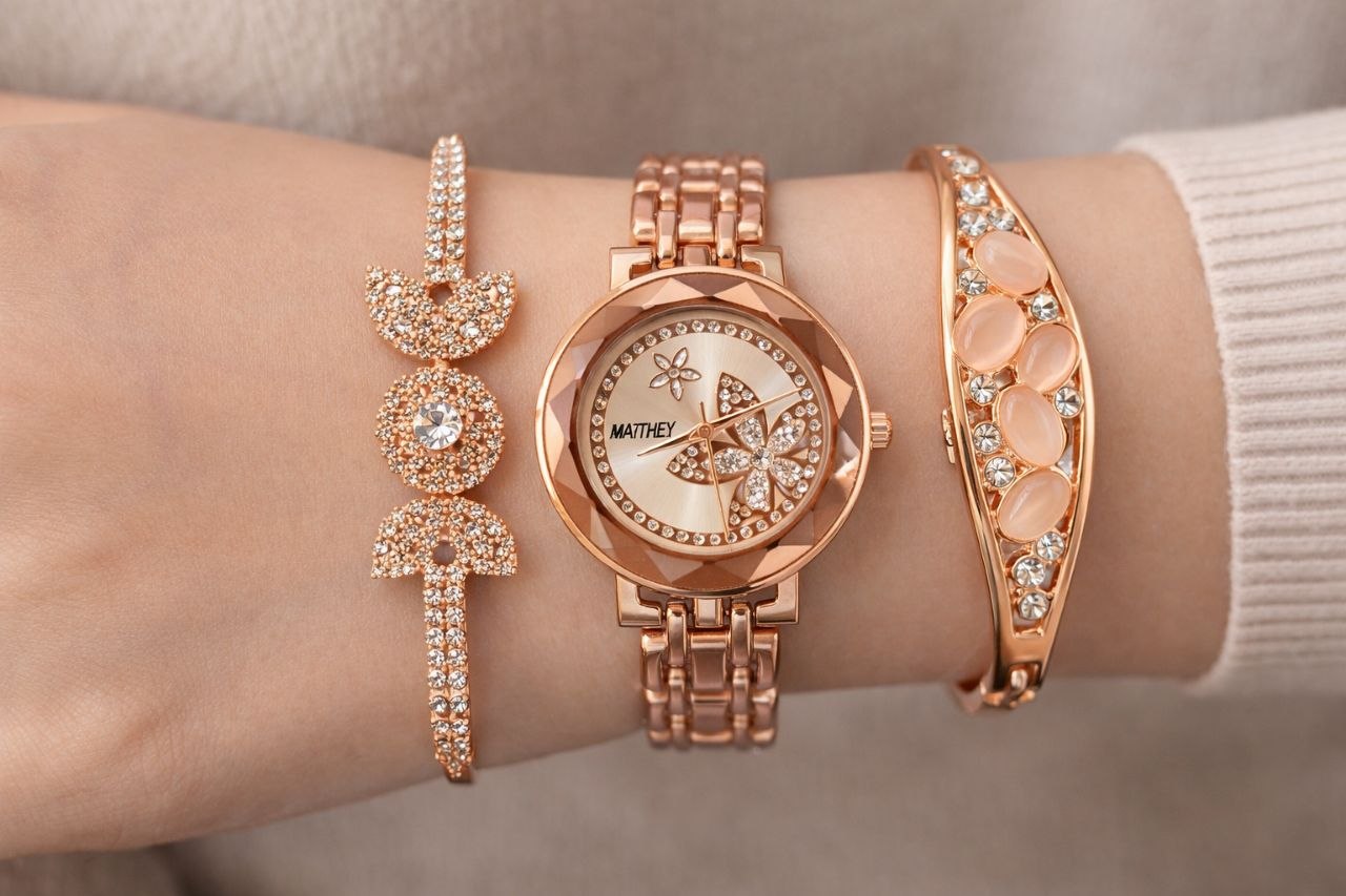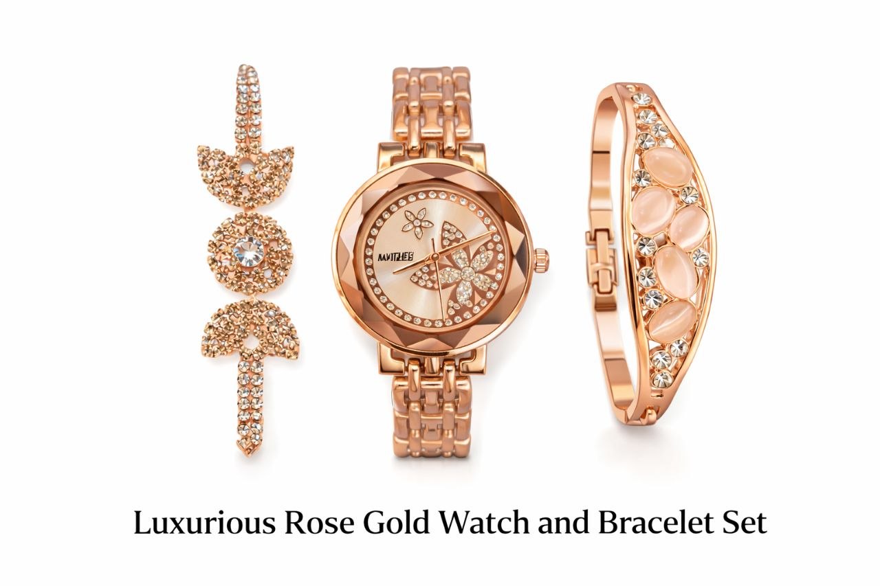 Luxury Rose Gold Women’s Watch & Bracelet Combo Set (3 Piece Set)