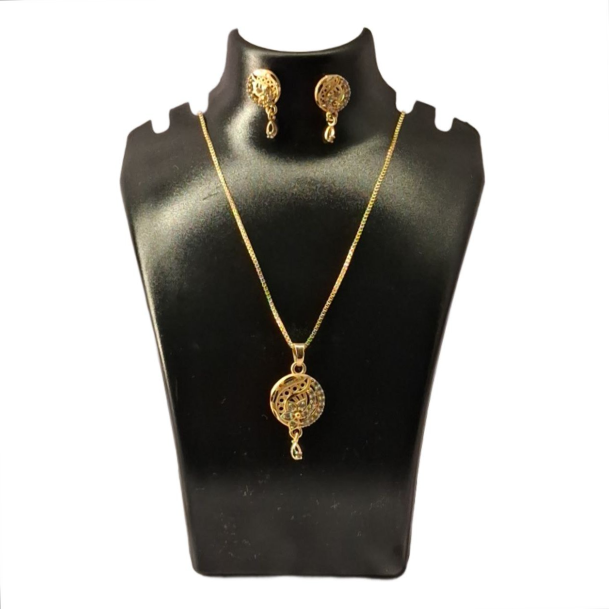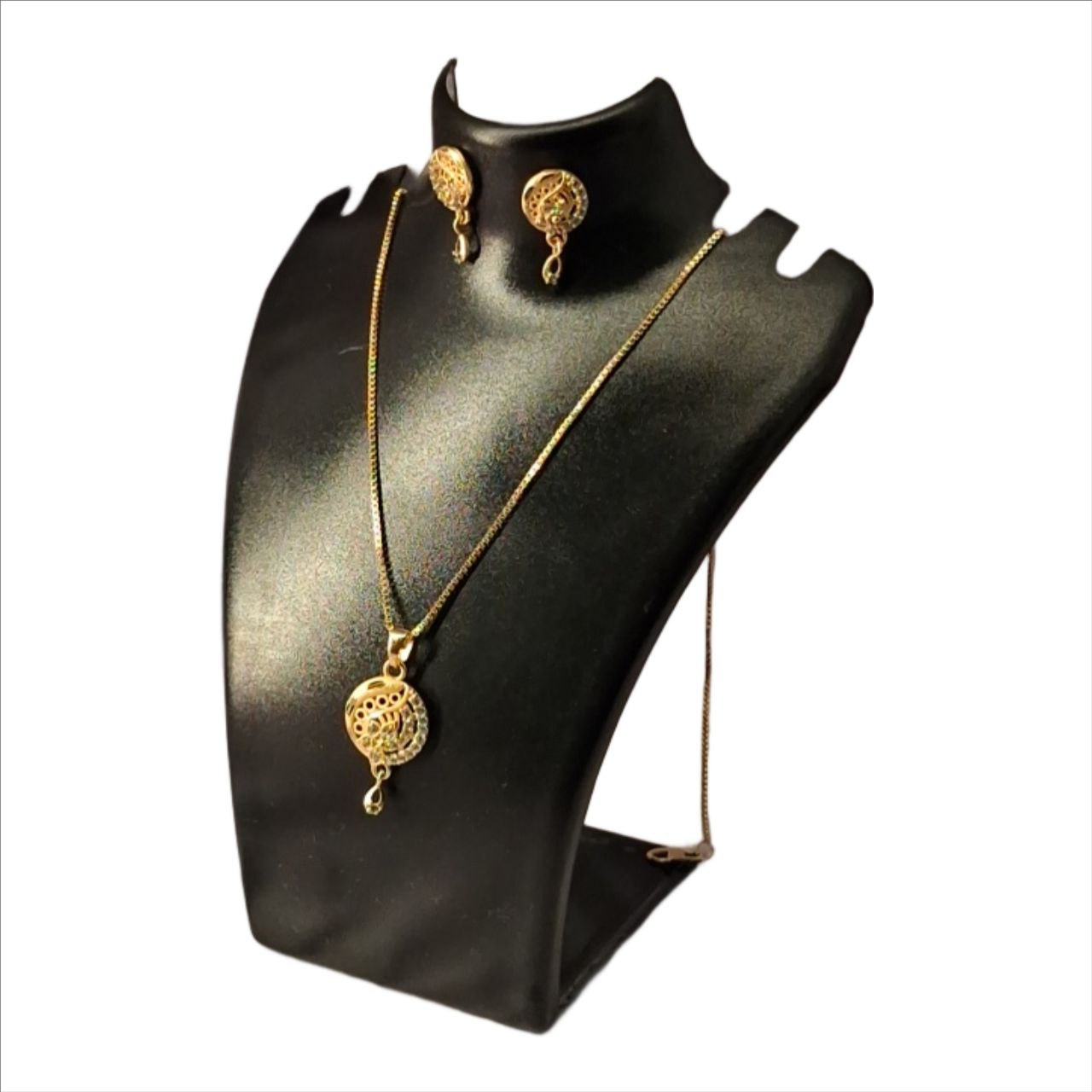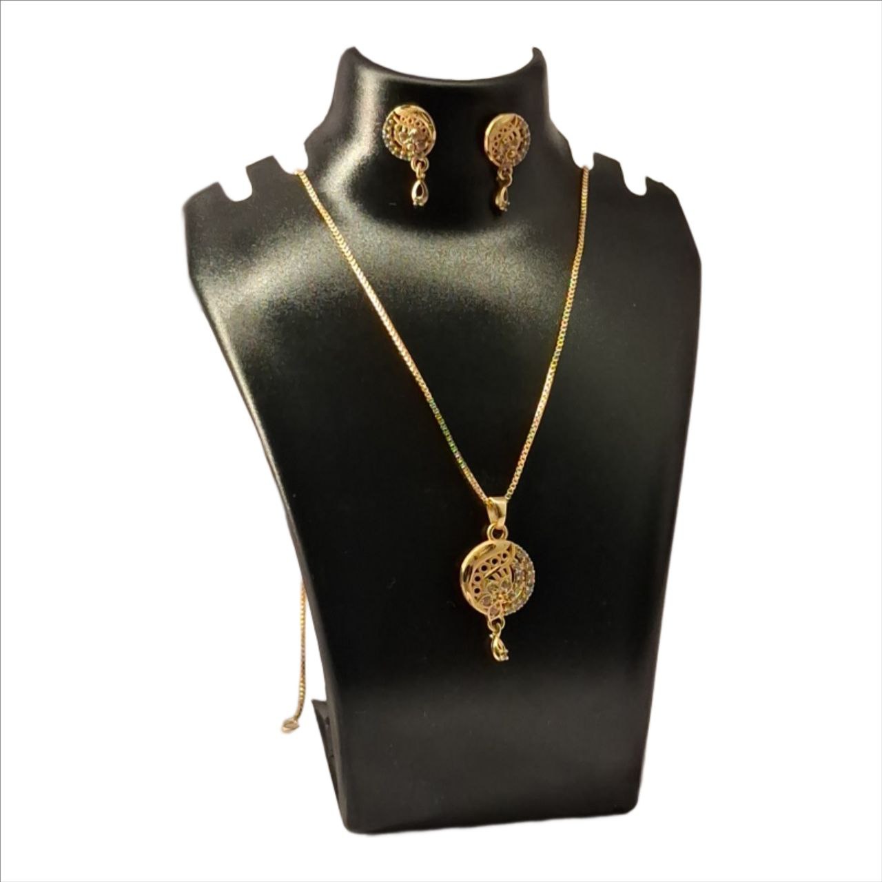 A delicate and elegant jewellery set featuring a slim gold-tone chain with a round filigree pendant and matching stud earrings. The intricate openwork design adds a refined traditional touch while maintaining a lightweight, minimal aesthetic suitable for everyday wear.