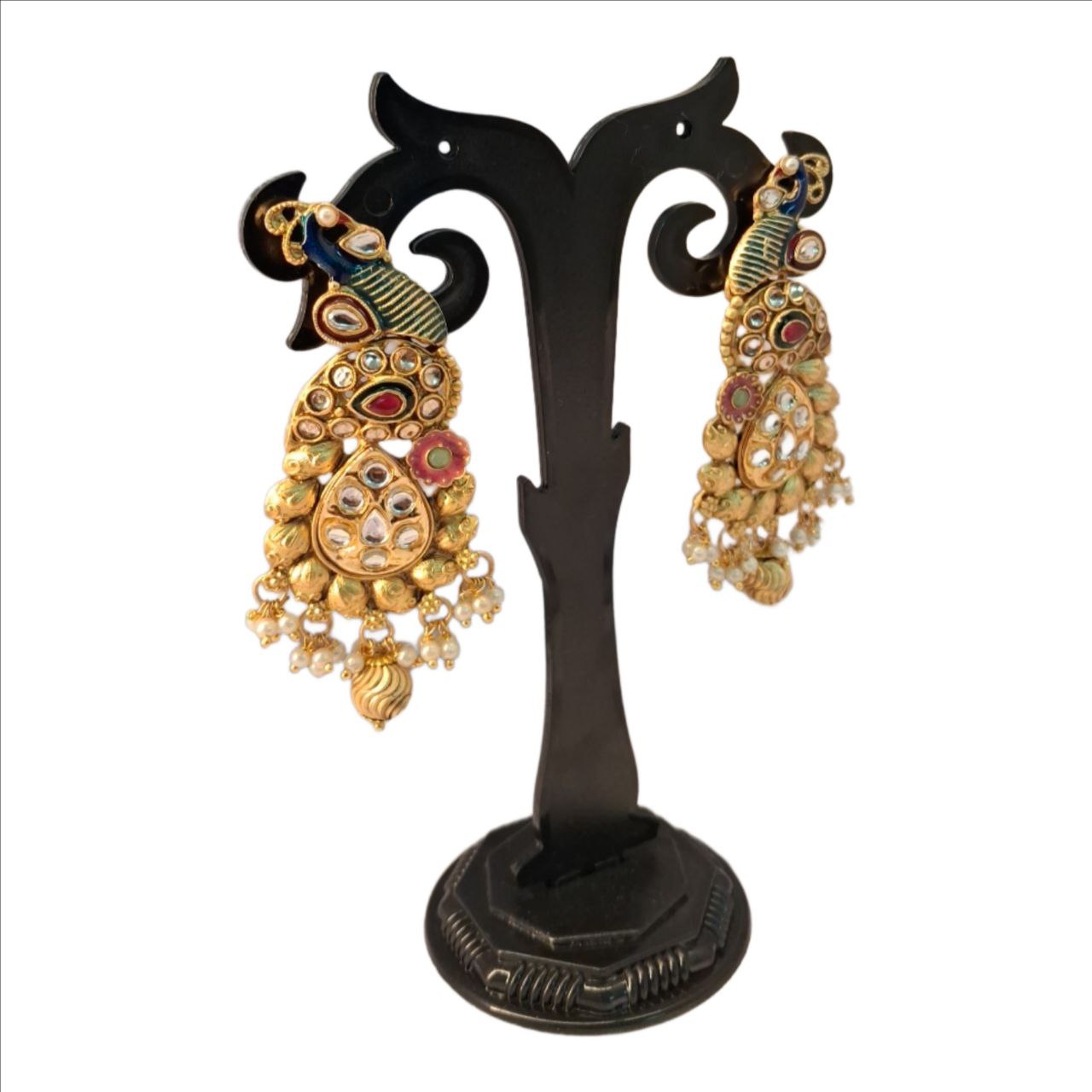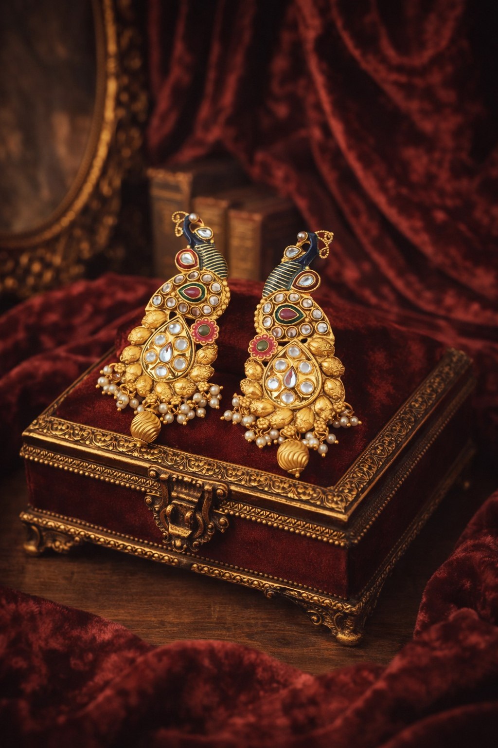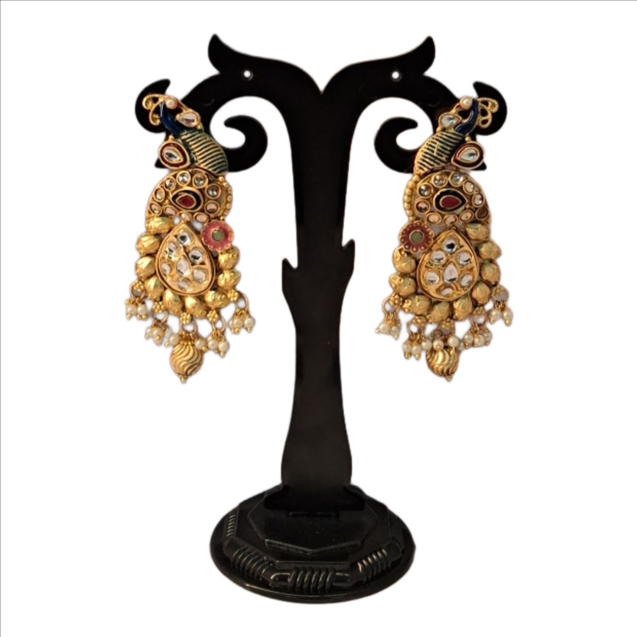 Artistic peacock-design earrings crafted in antique gold finish with kundan stones, meenakari detailing, and pearl danglers. A vibrant traditional statement piece ideal for weddings, festive occasions, and pairing with lehenga, saree, or ethnic suits.