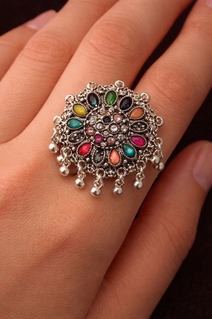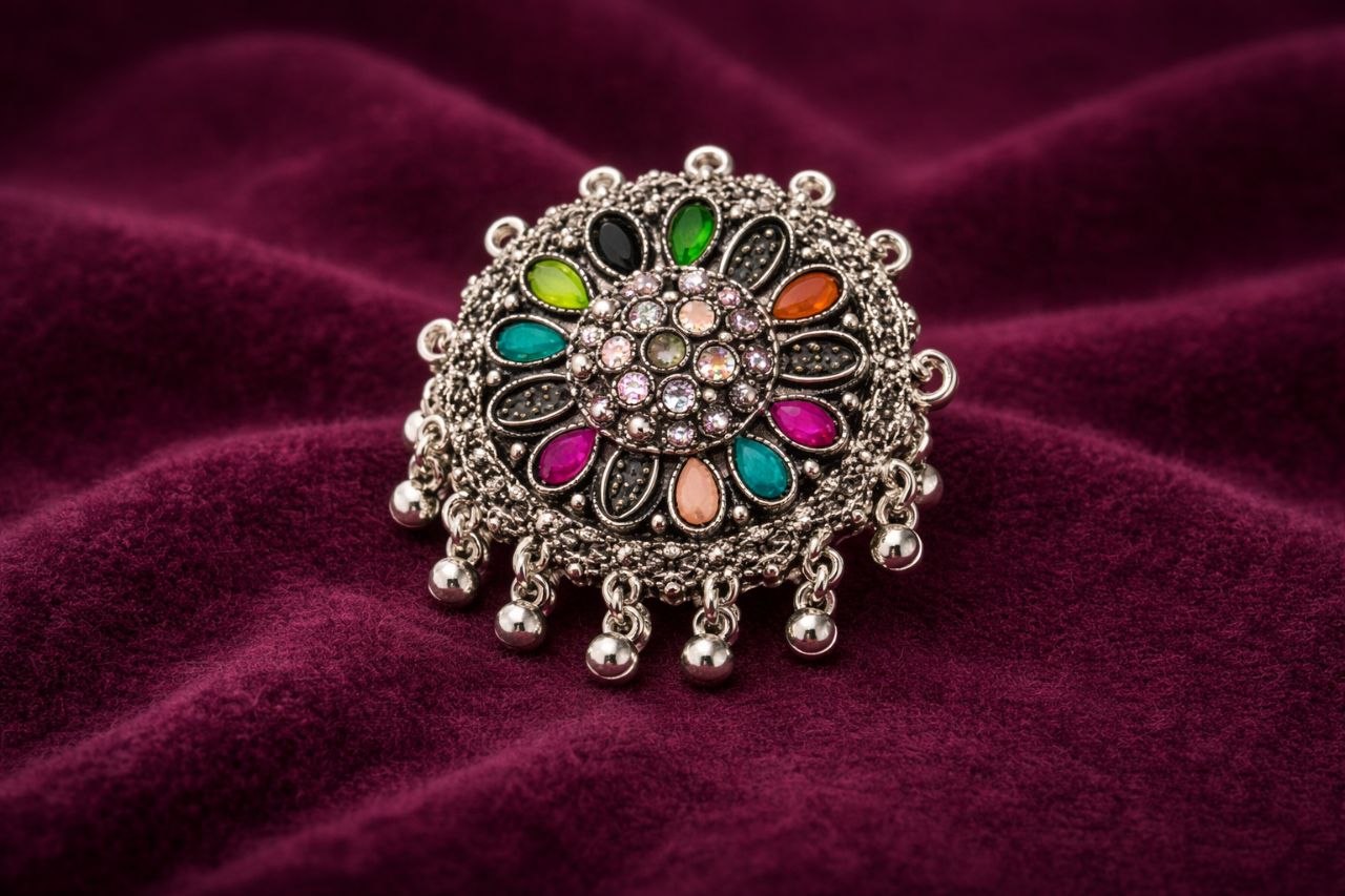 Add a touch of traditional elegance to your outfit with this beautifully crafted oxidized silver brooch. Designed in a floral-inspired circular pattern, it features vibrant multicolor stones that enhance its festive appeal. The intricate detailing and dangling bead accents give it a unique vintage charm, making it perfect for ethnic wear, sarees, shawls, and jackets.