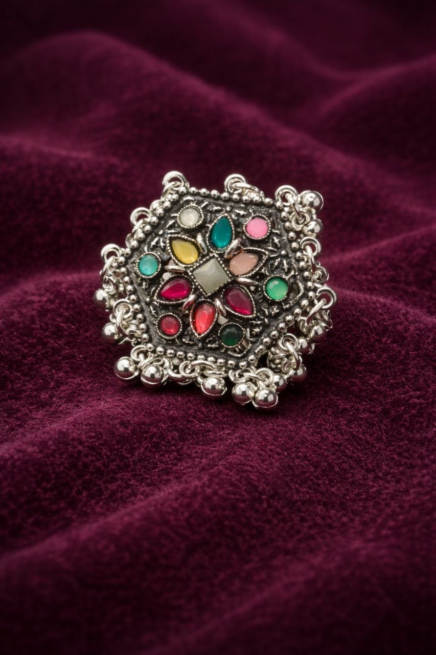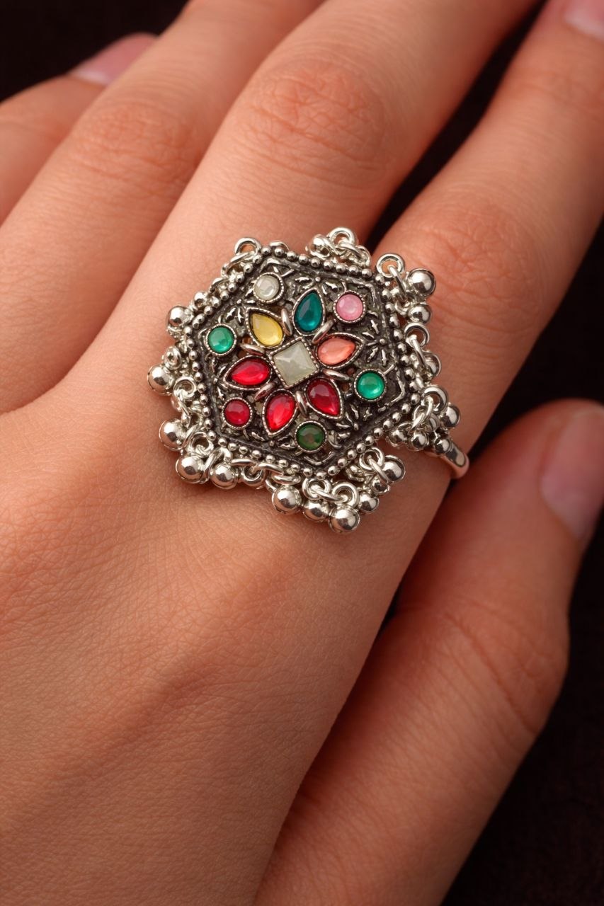 Enhance your ethnic style with this stunning oxidized silver statement ring, beautifully designed with vibrant multicolor stones arranged in a traditional geometric pattern. The intricate craftsmanship is highlighted by delicate bead detailing around the edges, giving it a classic vintage appeal.