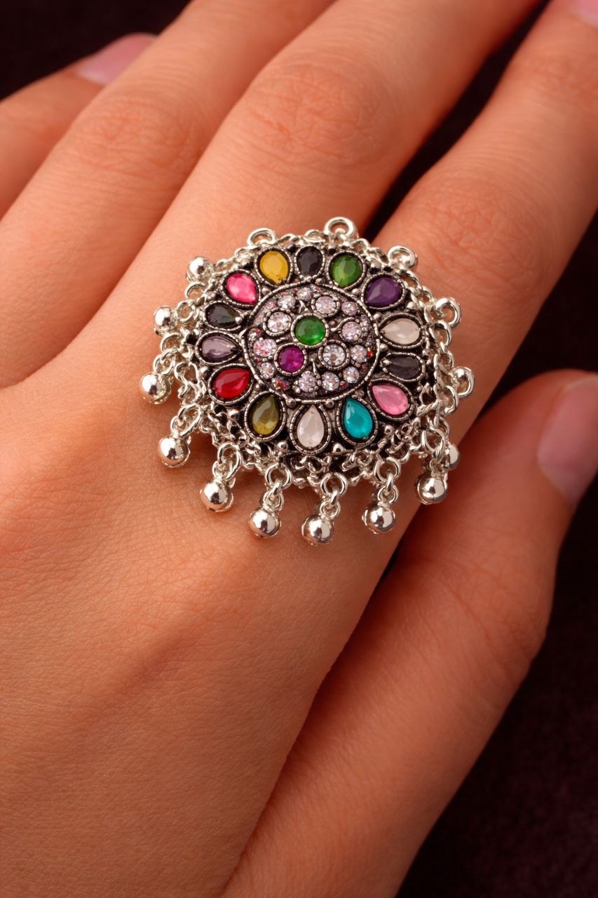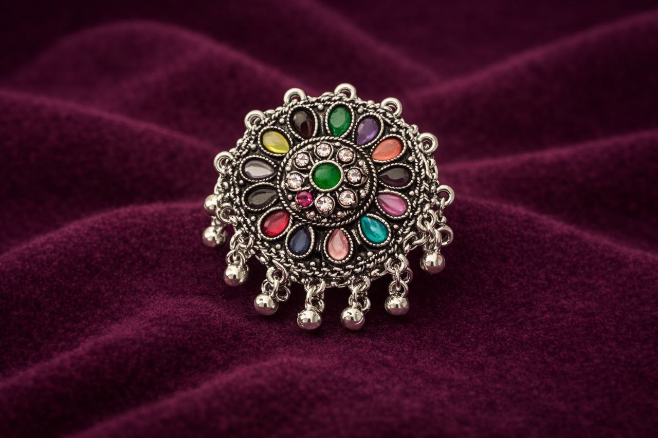 Navratna-Inspired Multicolor Stone Oxidized Silver Mandala Ring