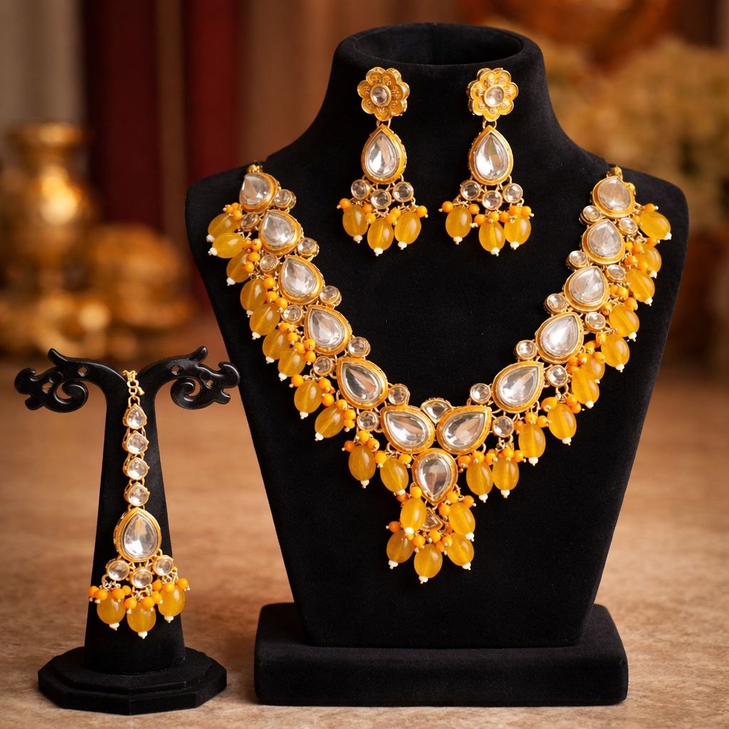 Elevate your ethnic elegance with this stunning Royal Amber Pearl Kundan Necklace Set. Designed with intricate craftsmanship, this luxurious set features radiant kundan stones paired with lustrous pearls and vibrant amber-hued drops, creating a rich and regal look.