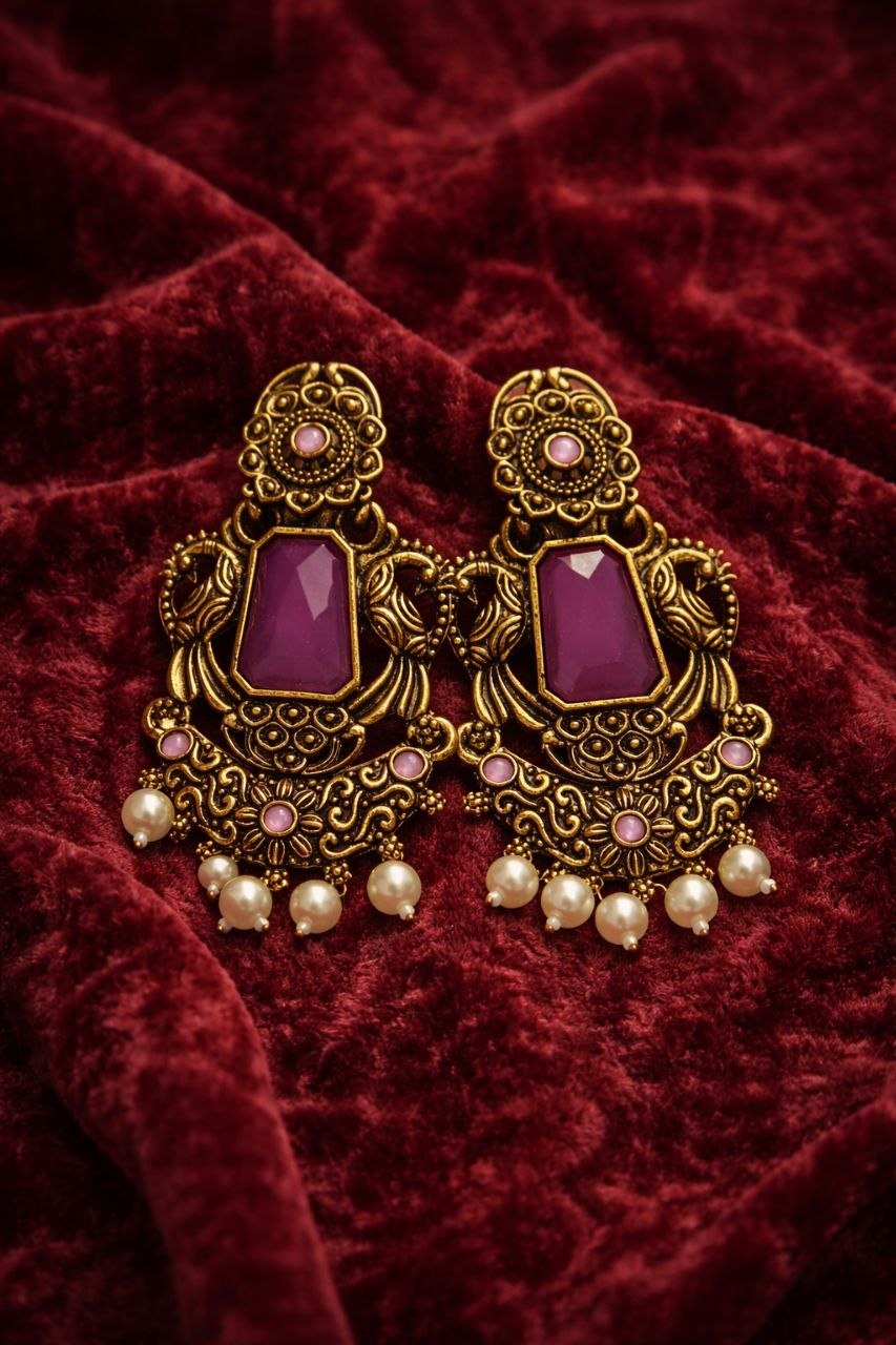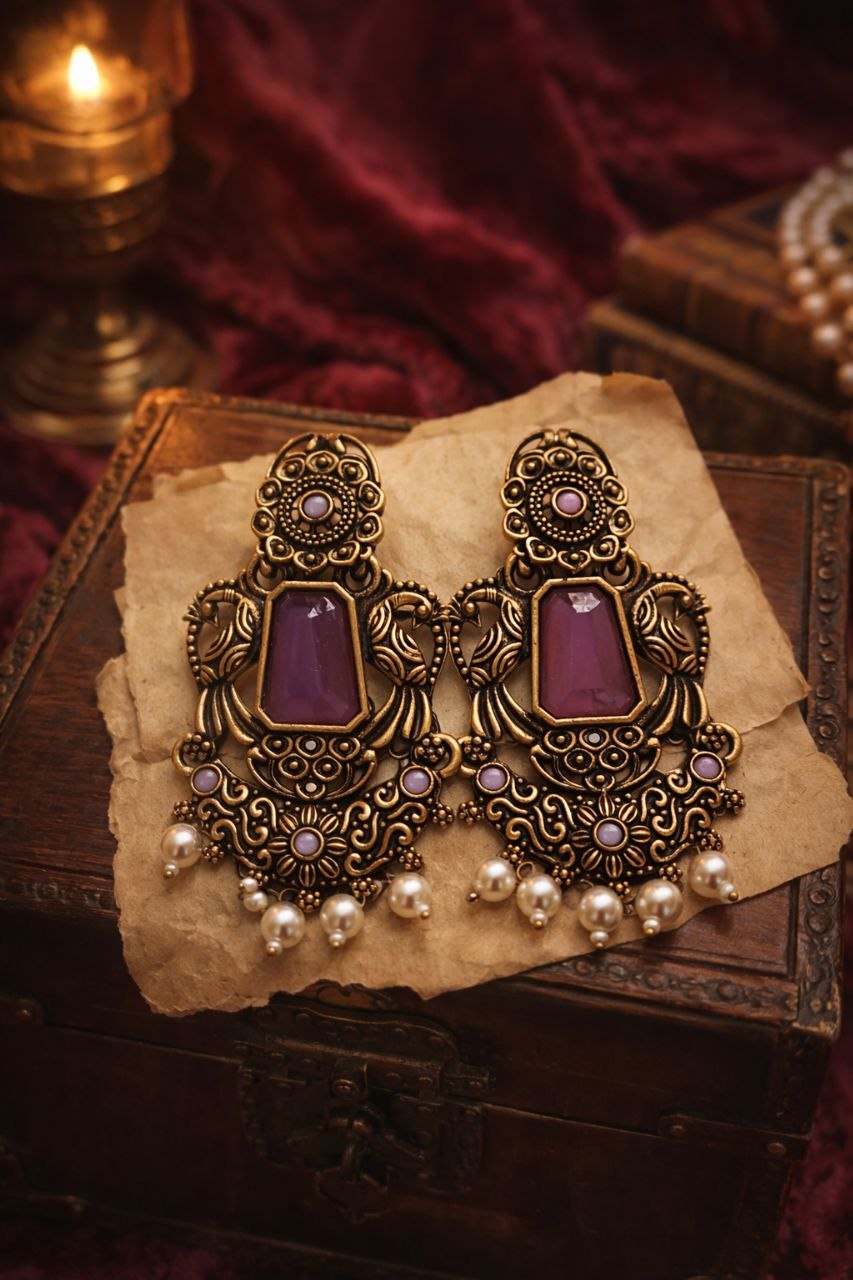 Add a touch of regal elegance to your look with these beautifully crafted antique-style earrings. Featuring a rich purple centerpiece set in intricate Kundan-inspired detailing, these earrings showcase traditional artistry with a modern appeal. The ornate gold-toned design is enhanced with delicate embellishments and finished with graceful pearl drops that add movement and charm.