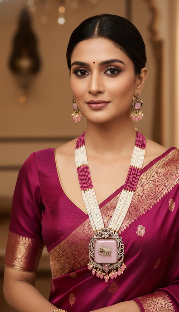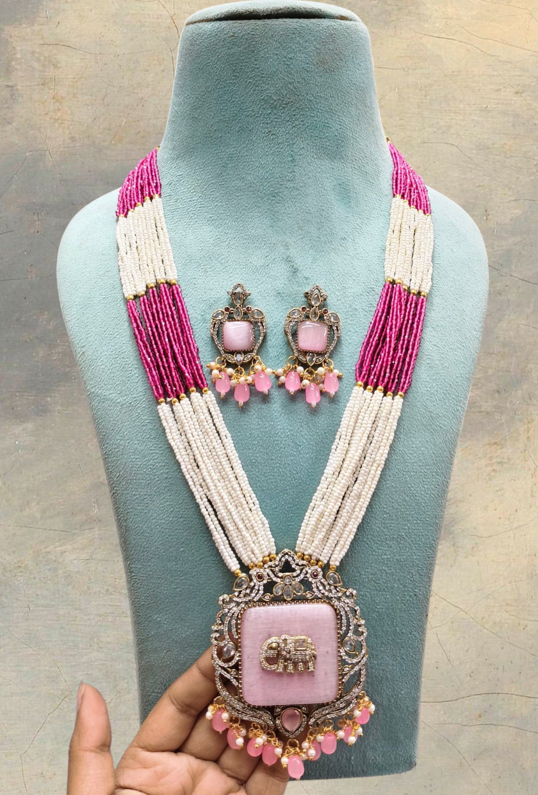 Enhance your ethnic elegance with this beautifully crafted blush pink necklace set, designed to bring a soft yet royal charm to your look. Featuring multiple strands of fine beads in a graceful combination of pink and ivory, this piece perfectly balances tradition with modern sophistication.
