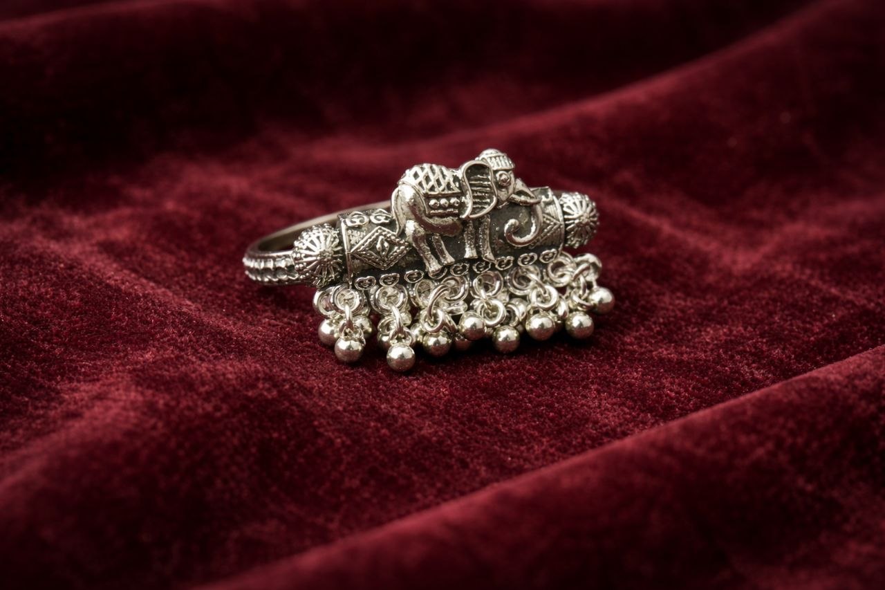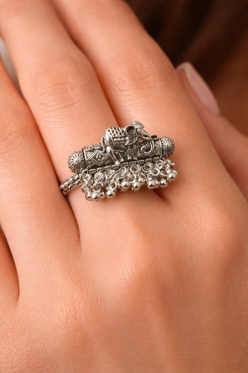 Celebrate heritage and elegance with this intricately crafted Royal Elephant Charm Oxidized Silver Ring. Featuring a beautifully detailed elephant motif—symbolizing wisdom, strength, and good luck—this statement piece showcases traditional artistry with a vintage oxidized finish. The delicate dangling bead accents add a graceful movement and enhance its ethnic appeal.