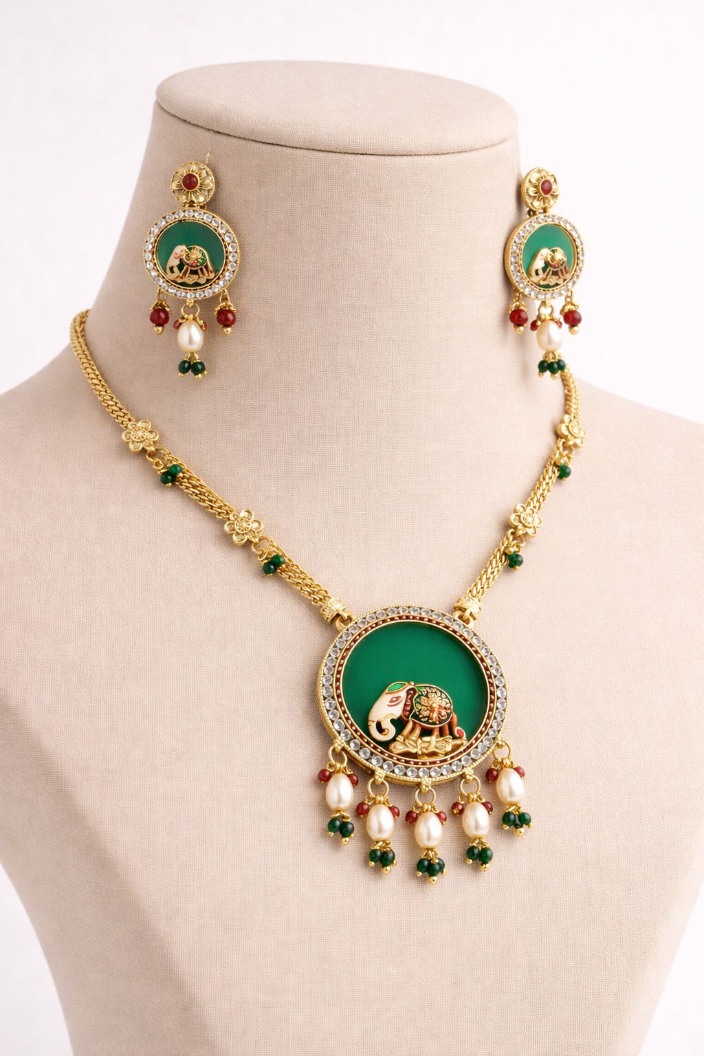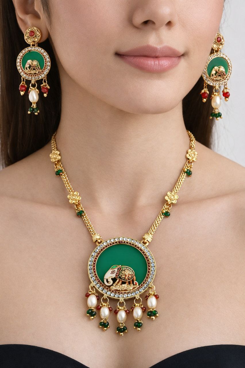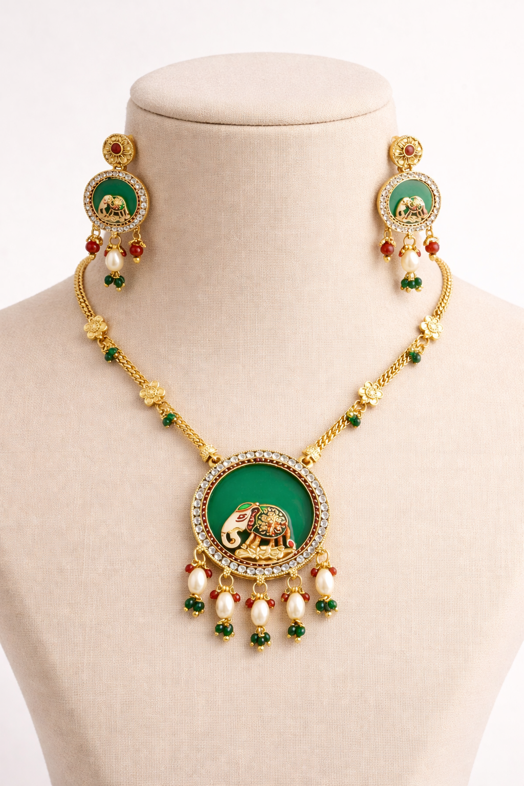 Add a touch of royal elegance to your jewelry collection with this beautifully crafted Royal Emerald Elephant Pendant Necklace Set. The necklace features a stunning round pendant with a traditional elephant motif, symbolizing wisdom, strength, and prosperity. The vibrant emerald-green enamel background enhances the intricate gold detailing and sparkling stone border, giving the piece a rich and luxurious appeal.