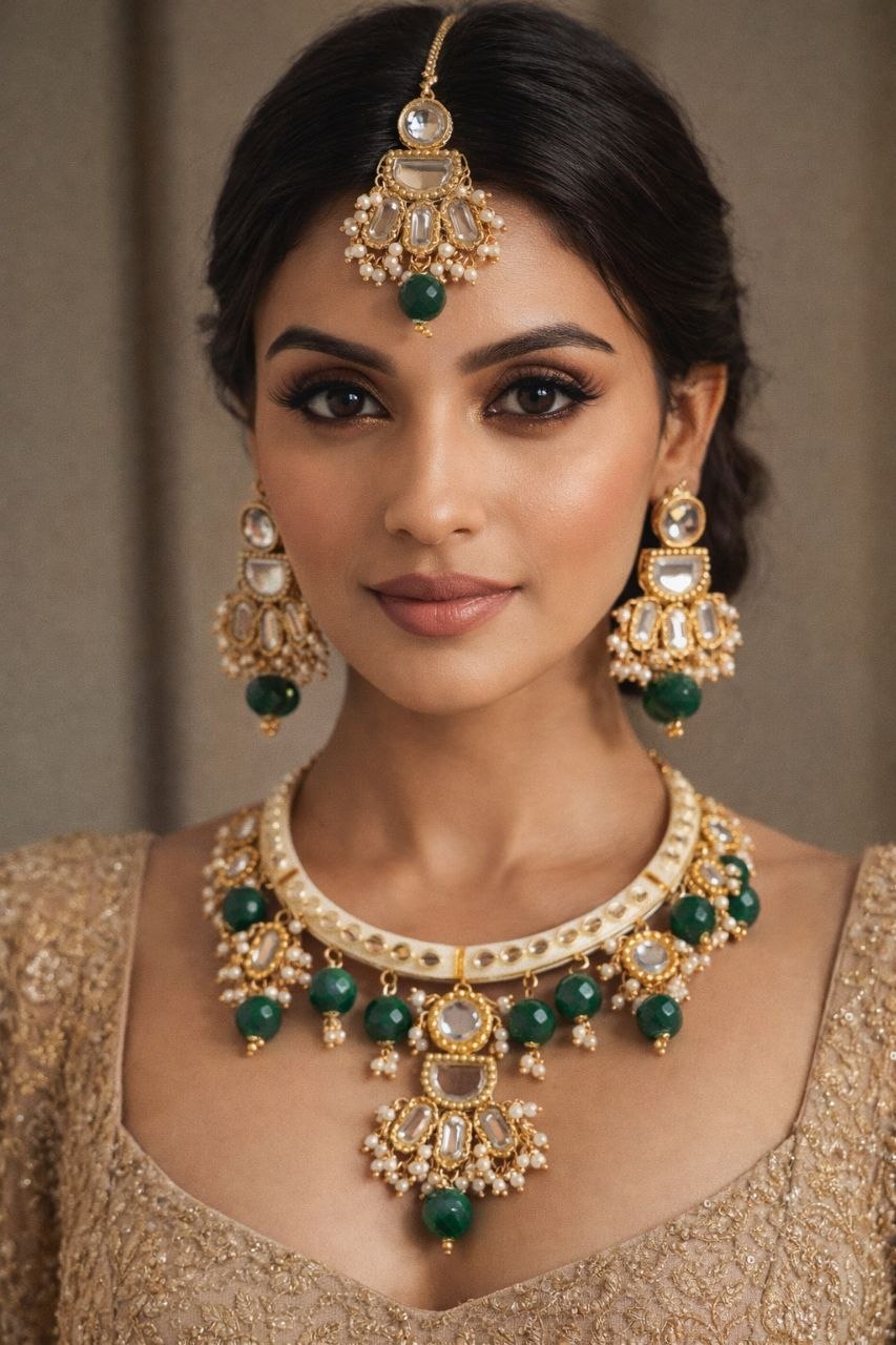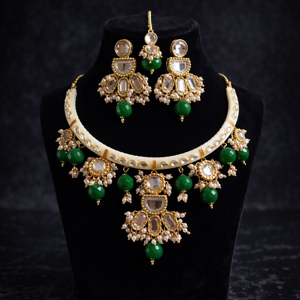 Elevate your ethnic look with this exquisite Emerald Kundan Hasali , designed to reflect timeless elegance and regal charm. Crafted with intricate Kundan work, this statement piece features a beautifully structured ivory-tone hasali adorned with shimmering stones, delicate pearls, and striking emerald-green beads that add a luxurious touch.