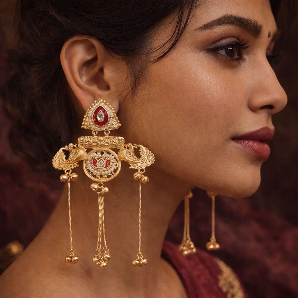 Add a touch of royal elegance to your jewelry collection with these exquisite gold-tone Kashmiri long chain earrings. Designed with intricate craftsmanship, these statement earrings feature a beautifully detailed top stud connected to multiple delicate hanging chains adorned with small motifs and embellishments.
