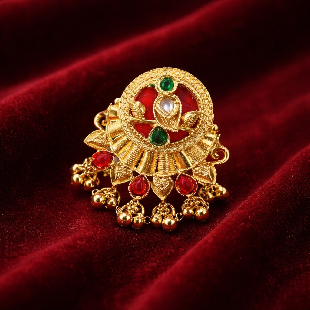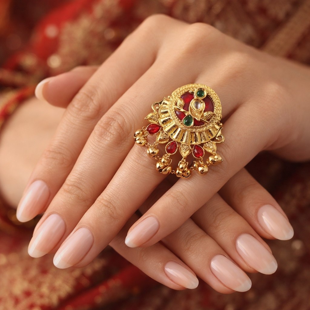 Add a touch of regal elegance to your jewelry collection with this beautifully crafted gold-tone Kundan statement ring. Designed in a graceful semi-circular shape, this piece features a stunning arrangement of red and green stones set in intricate traditional patterns, creating a rich and festive look.