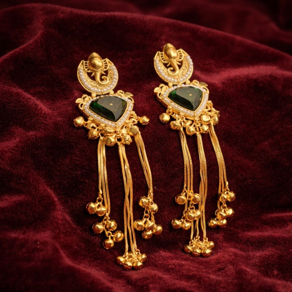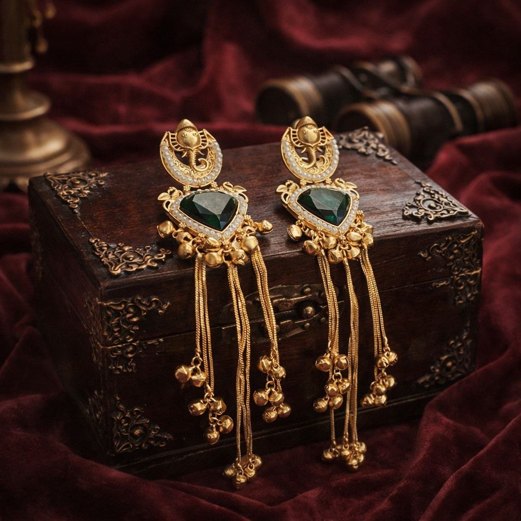 Add a graceful and contemporary touch to your ethnic collection with these elegant gold-tone kasmiri dangler earrings. Featuring a beautifully crafted heart-shaped green stone centerpiece, these earrings are designed to stand out with their unique and charming appeal. The intricate detailing around the motif enhances their richness, giving them a luxurious finish.