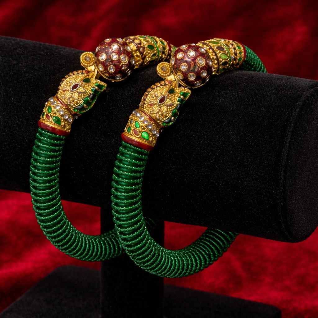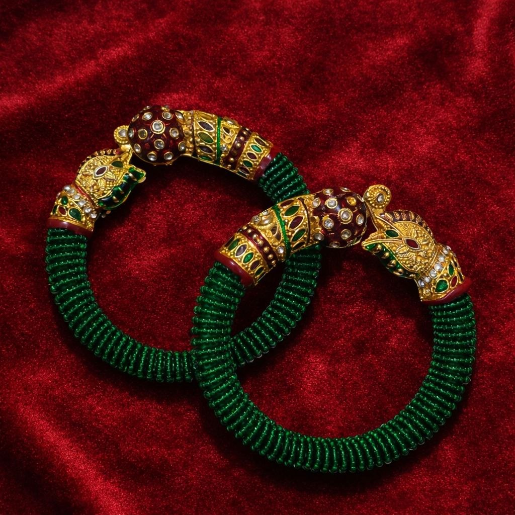 Add a touch of royal elegance to your jewelry collection with these stunning green Meenakari Kundan kada bangles. Designed with intricate craftsmanship, these bangles feature a rich green base wrapped in fine thread detailing, beautifully complemented by antique gold-tone motifs and traditional Kundan stone work.