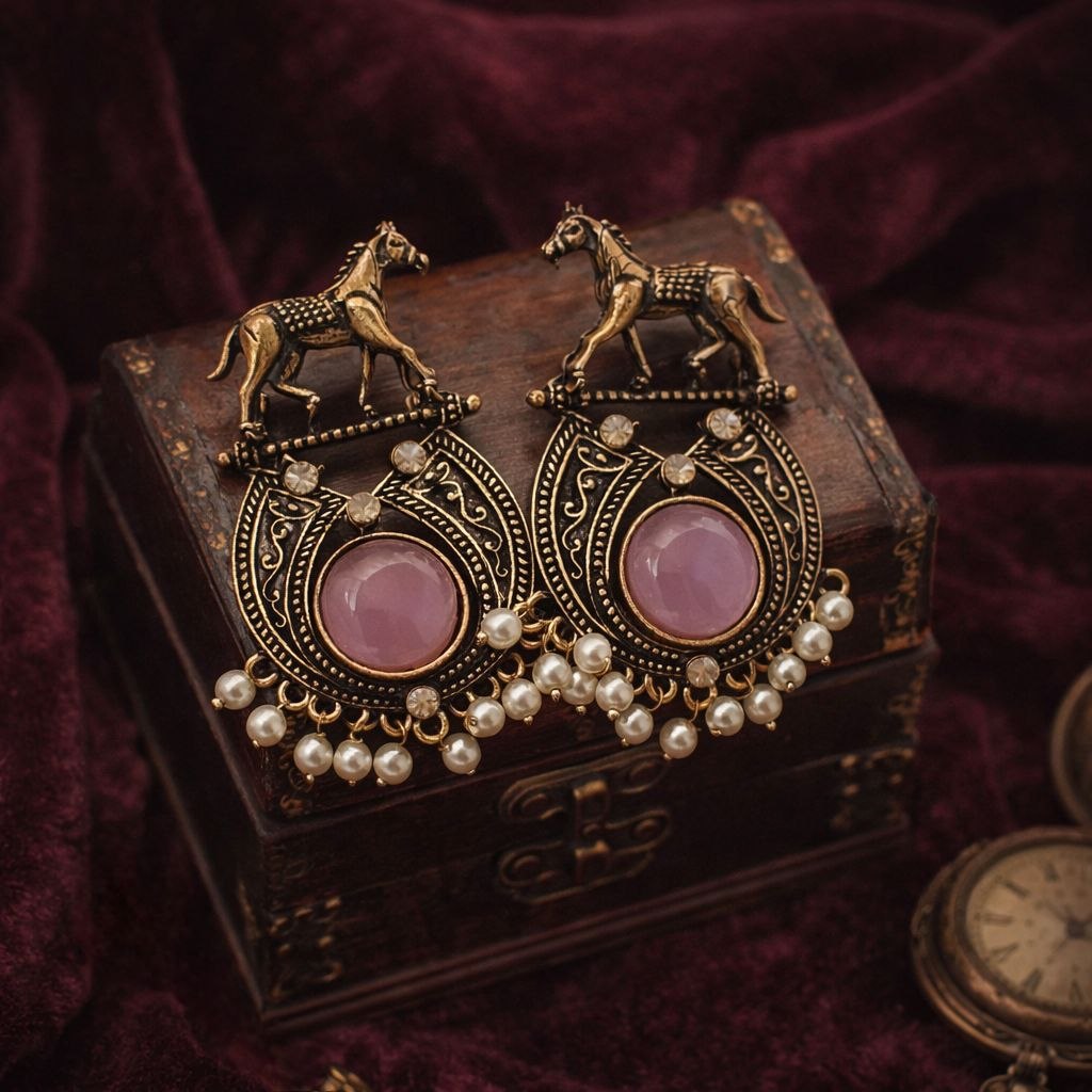 Add a touch of vintage royalty to your collection with these beautifully crafted horse motif statement earrings. Designed with an intricately detailed antique gold frame, these earrings feature a soft pink center stone that brings a delicate yet luxurious charm. The finely sculpted horse figures on top enhance their regal appeal, while the pearl bead drops add graceful movement and elegance.