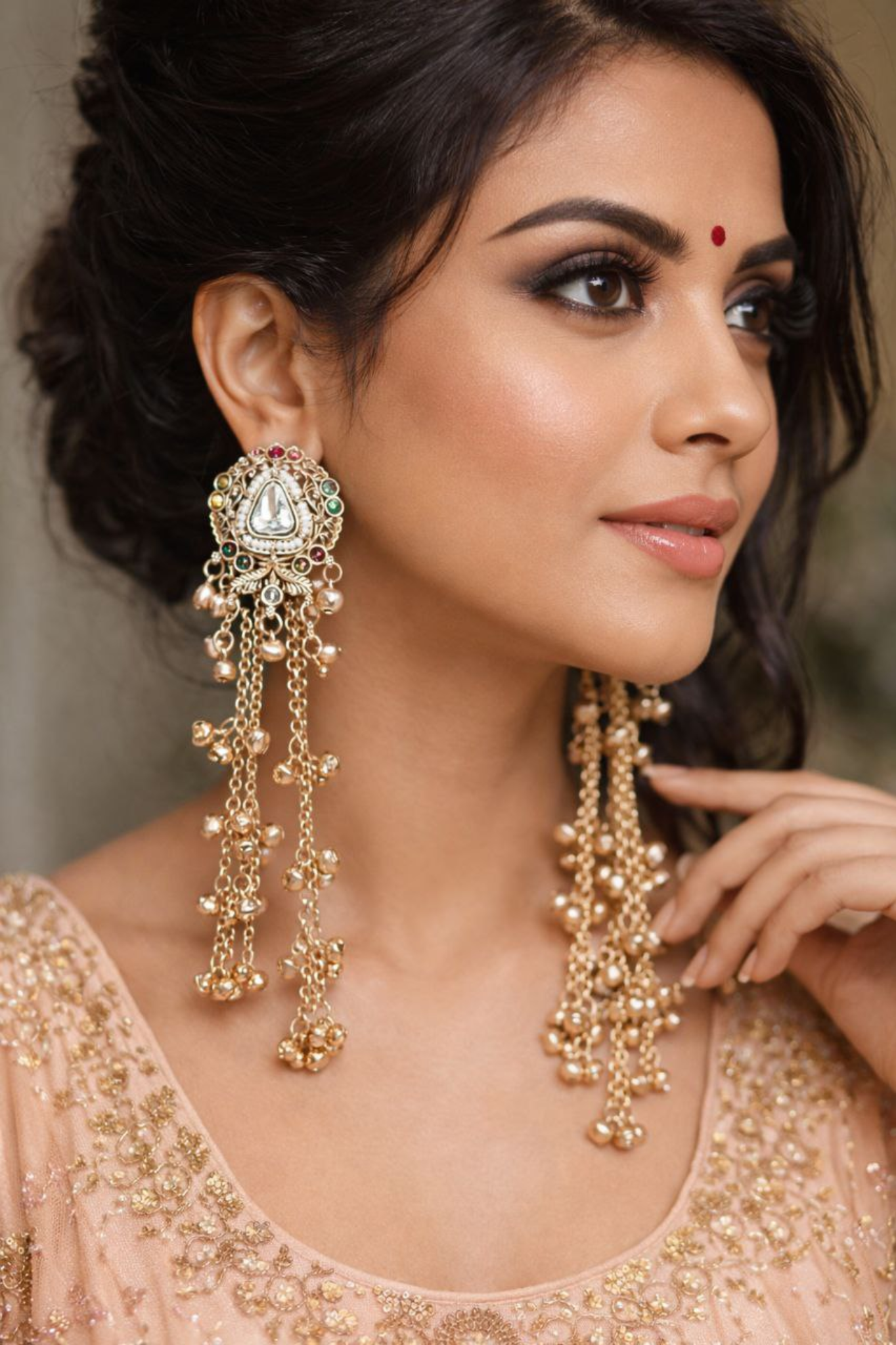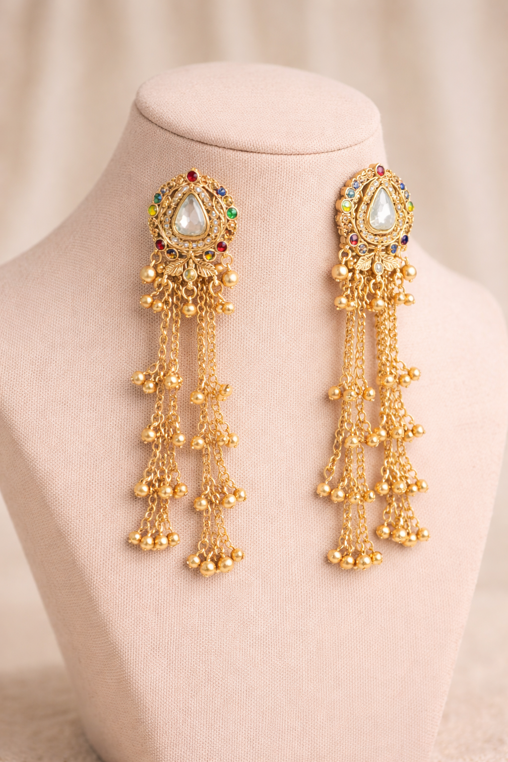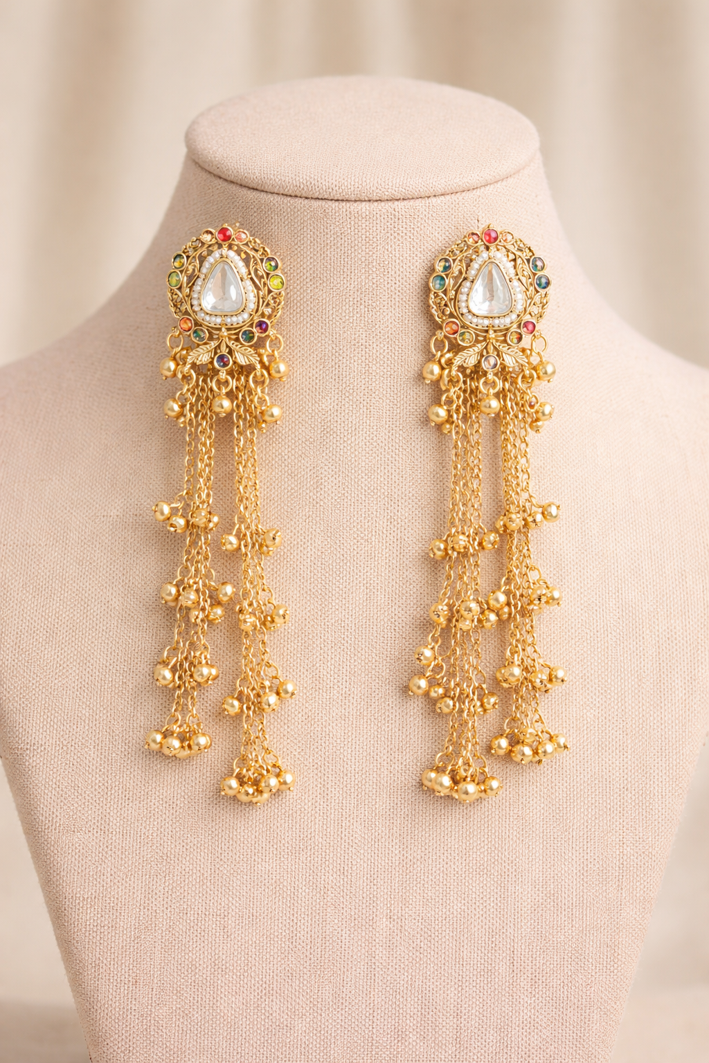 Add a touch of regal elegance to your jewelry collection with these stunning Royal Kundan Cascade Long Earrings. Designed with a beautifully detailed top stud featuring a teardrop-shaped kundan stone, the earrings are surrounded by delicate multicolor stones that enhance their traditional charm. The intricate gold-tone framework flows into graceful cascading chains adorned with small golden bead drops, creating a luxurious chandelier-style look.
