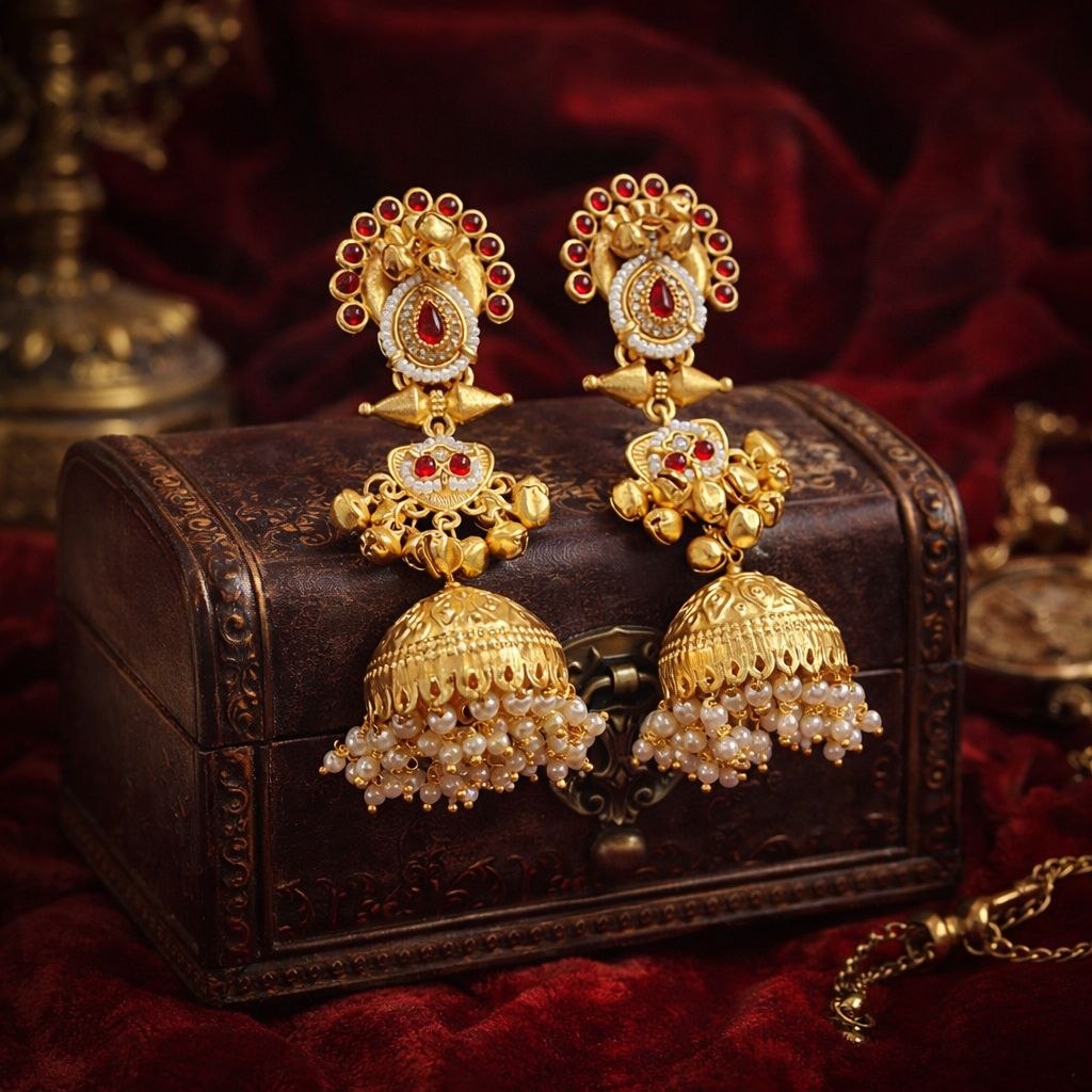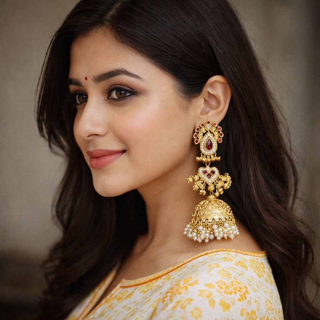 Elevate your traditional look with these stunning royal-style Kundan jhumka earrings, crafted to perfection with intricate detailing and timeless elegance. Featuring a beautifully designed stud with teardrop Kundan stones, these earrings flow into an ornate dome-shaped jhumka adorned with delicate pearl drops.
