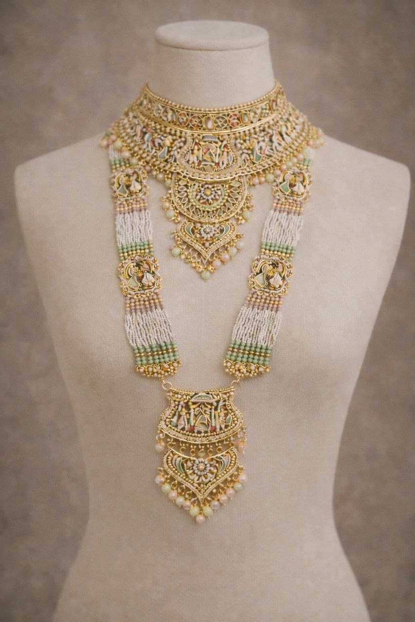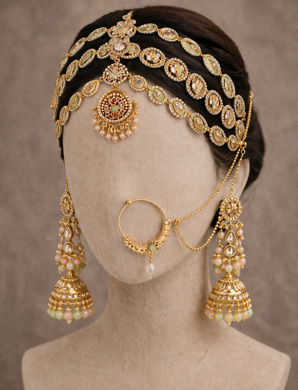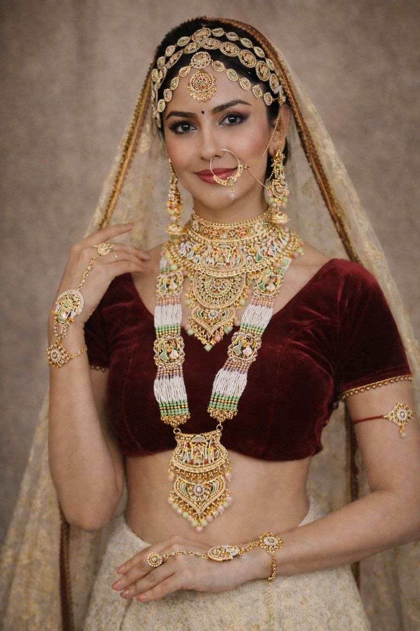 The set includes a grand choker necklace, a long layered haar, matching jhumka earrings, a statement maang tikka, and a classic nath (nose ring), completing the perfect bridal look. The rich gold-tone finish paired with soft hues enhances its royal charm, making it ideal for weddings, receptions, and festive occasions.
