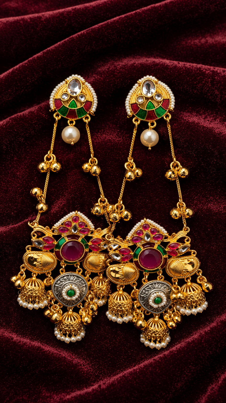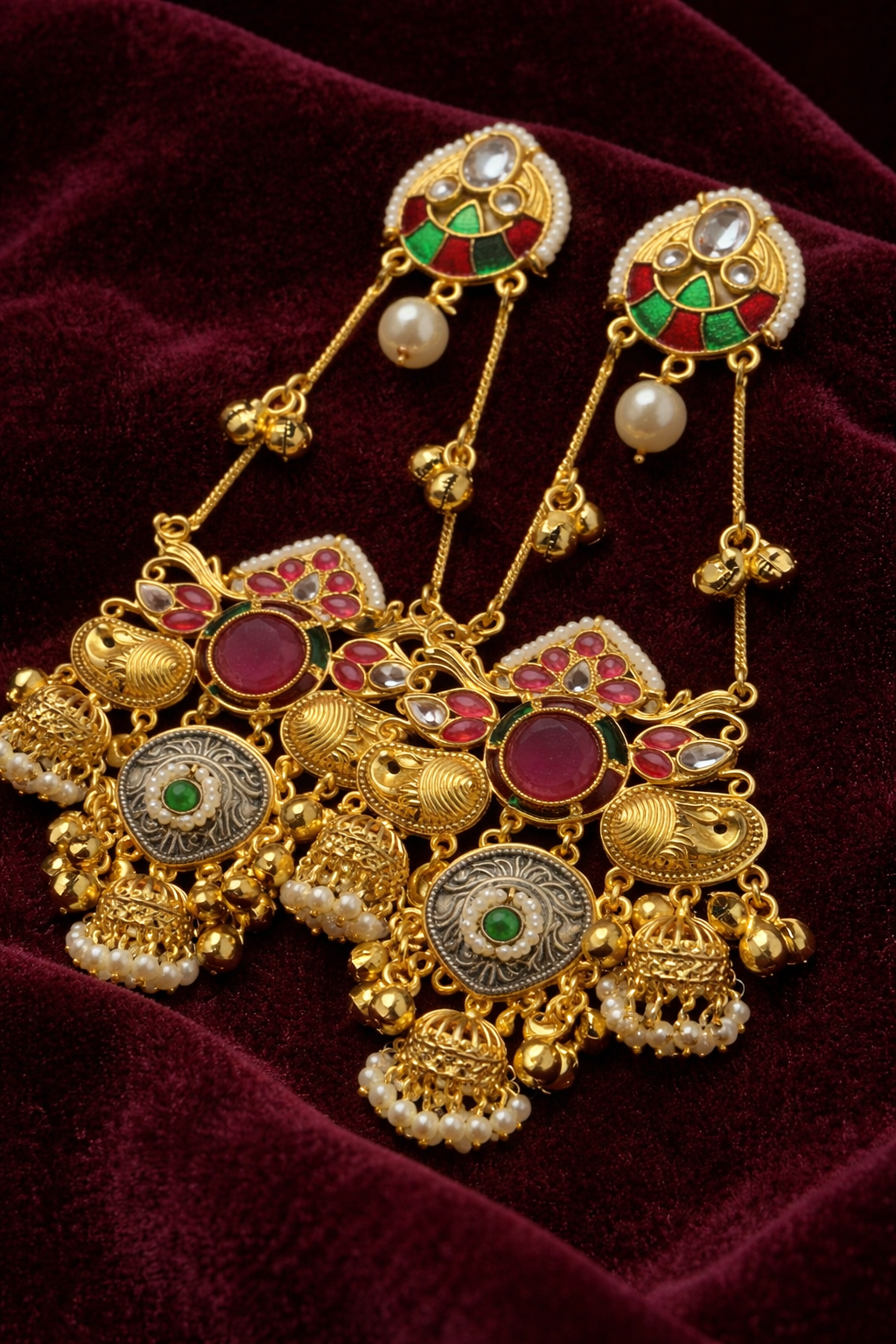 Elevate your ethnic look with this stunning Royal Meenakari Heritage Kundan Necklace Set, crafted with intricate traditional artistry. Featuring vibrant red and green meenakari work, this statement piece is adorned with finely set kundan stones and detailed gold-plated motifs. The necklace is beautifully enhanced with pearl bead drops and ornate coin-style charms, giving it a rich, regal appeal.