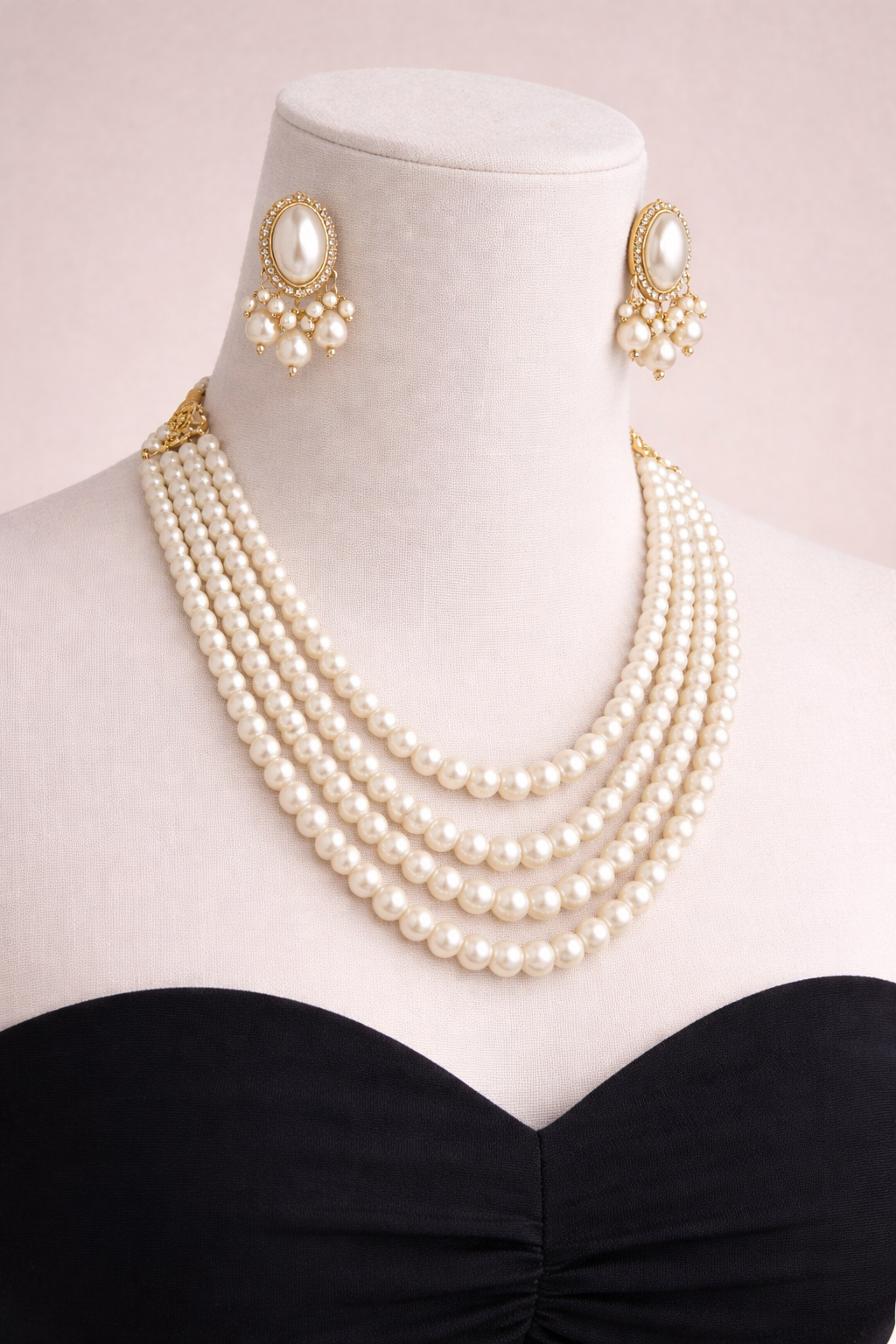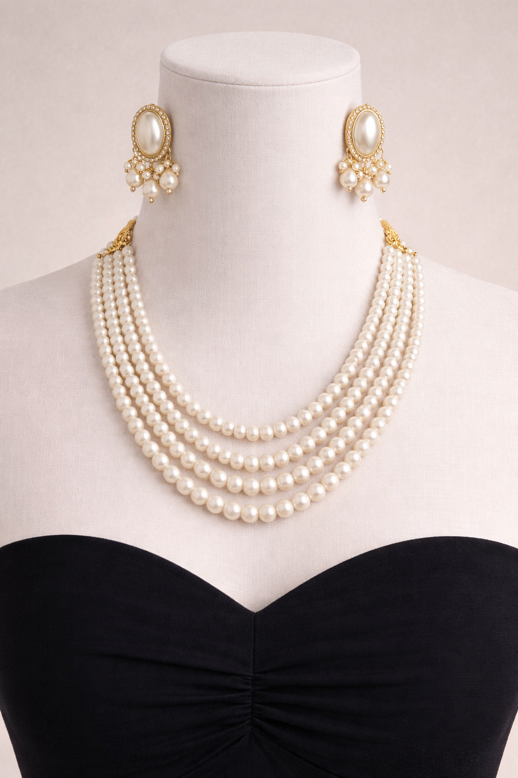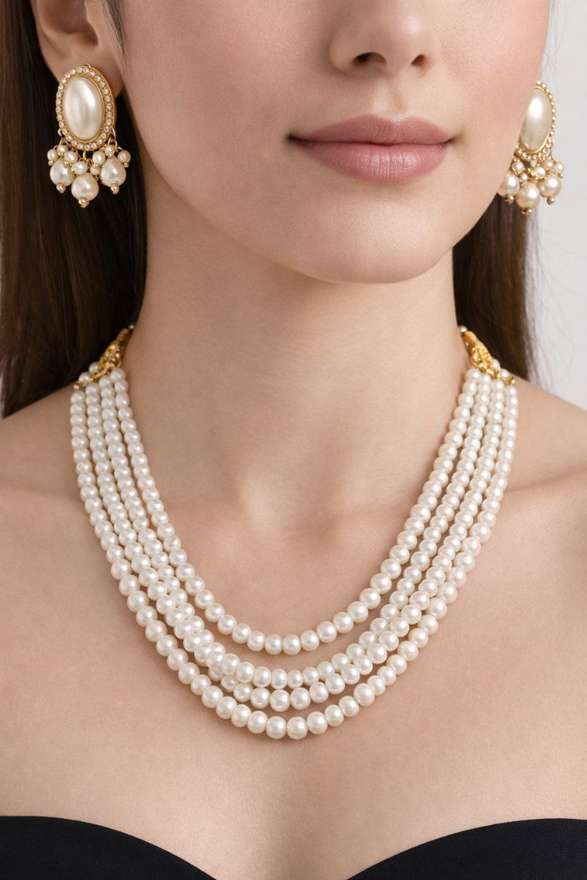 Elevate your elegance with this royal multi-layer pearl necklace set, designed to bring timeless sophistication to any outfit. The necklace features four beautifully layered strands of lustrous white pearls, creating a graceful drape that enhances the neckline. Complementing the necklace are elegant oval pearl drop earrings, framed with delicate gold-tone detailing and accented with small dangling pearls for a refined finish.