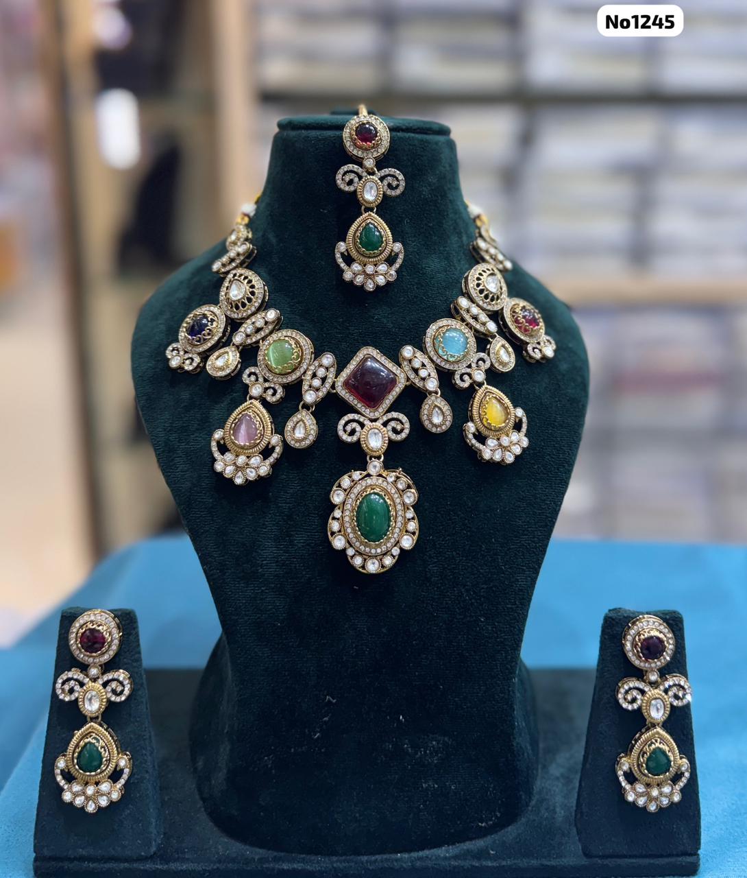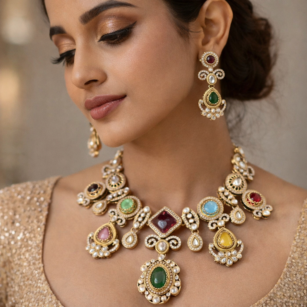 Celebrate timeless tradition with this stunning Royal Navratna Kundan Necklace Set, beautifully crafted to reflect regal elegance. Featuring a vibrant arrangement of multicolored stones inspired by the Navratna (nine gems), this masterpiece blends rich hues like emerald green, ruby red, sapphire blue, and soft pastel tones in an intricate Kundan setting.