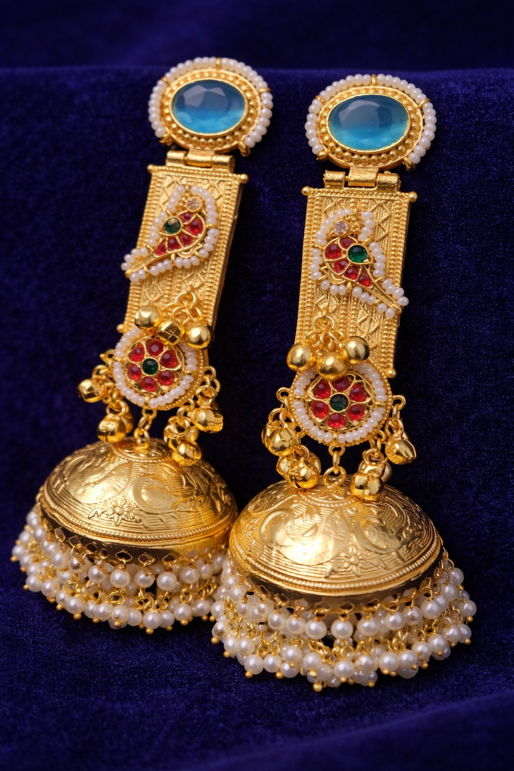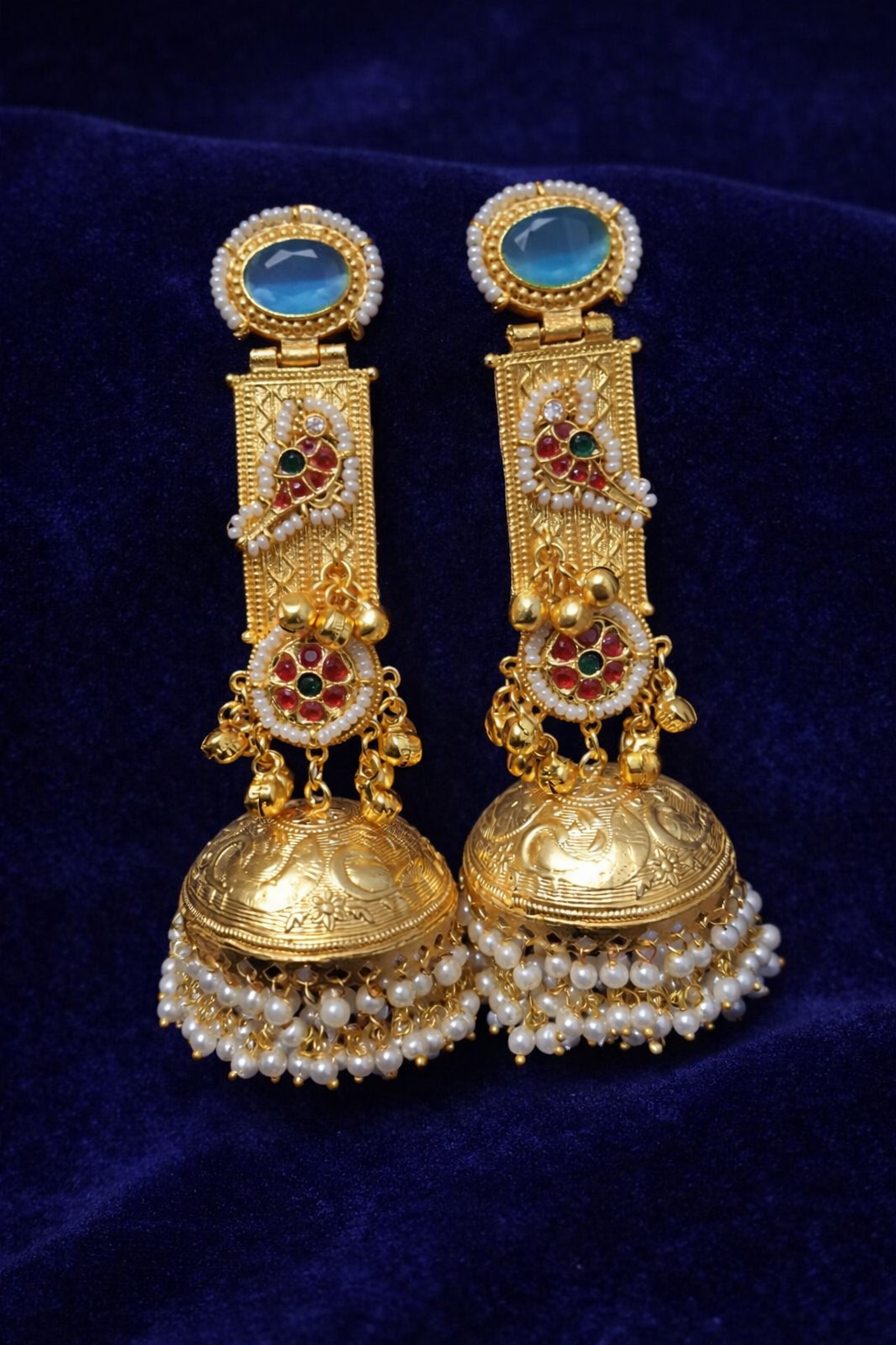 Elevate your ethnic look with these exquisite royal-style jhumka earrings, crafted with intricate detailing and timeless elegance. Featuring a stunning peacock motif adorned with red and green kundan stones, these earrings showcase a rich traditional design. The top is highlighted with a striking sky-blue stone, adding a modern touch to the classic aesthetic.