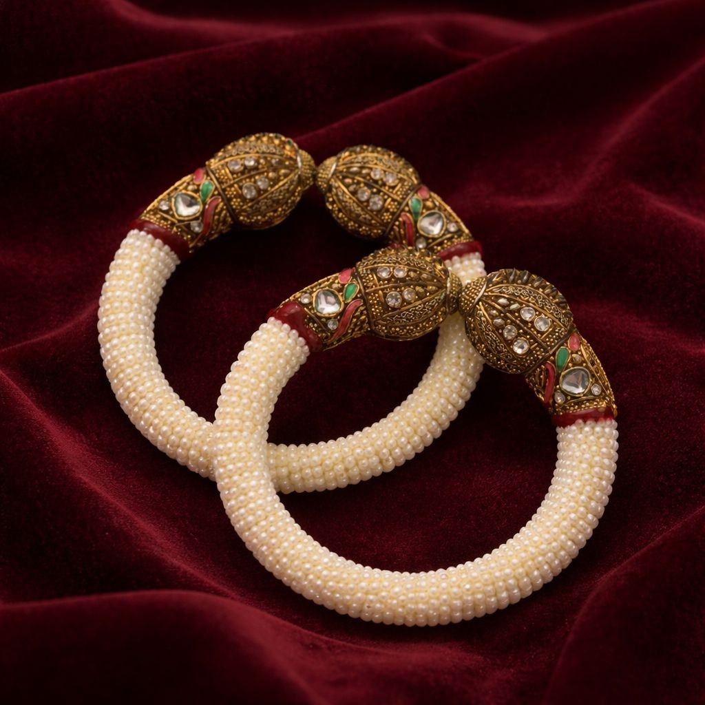 Classic Ivory Pearl Kada Bangles with Antique Gold Detailing (Ethnic Pair)