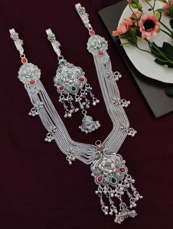 Elevate your traditional look with this exquisite Rajwada-inspired silver kamarbandh, crafted to reflect timeless elegance and royal charm. Featuring intricate floral motifs and finely layered chains, this waist belt is beautifully adorned with vibrant red and green stones that add a rich, festive touch. The detailed central pendant and delicate dangling elements enhance its graceful appeal, making it perfect for weddings, bridal wear, and special occasions.