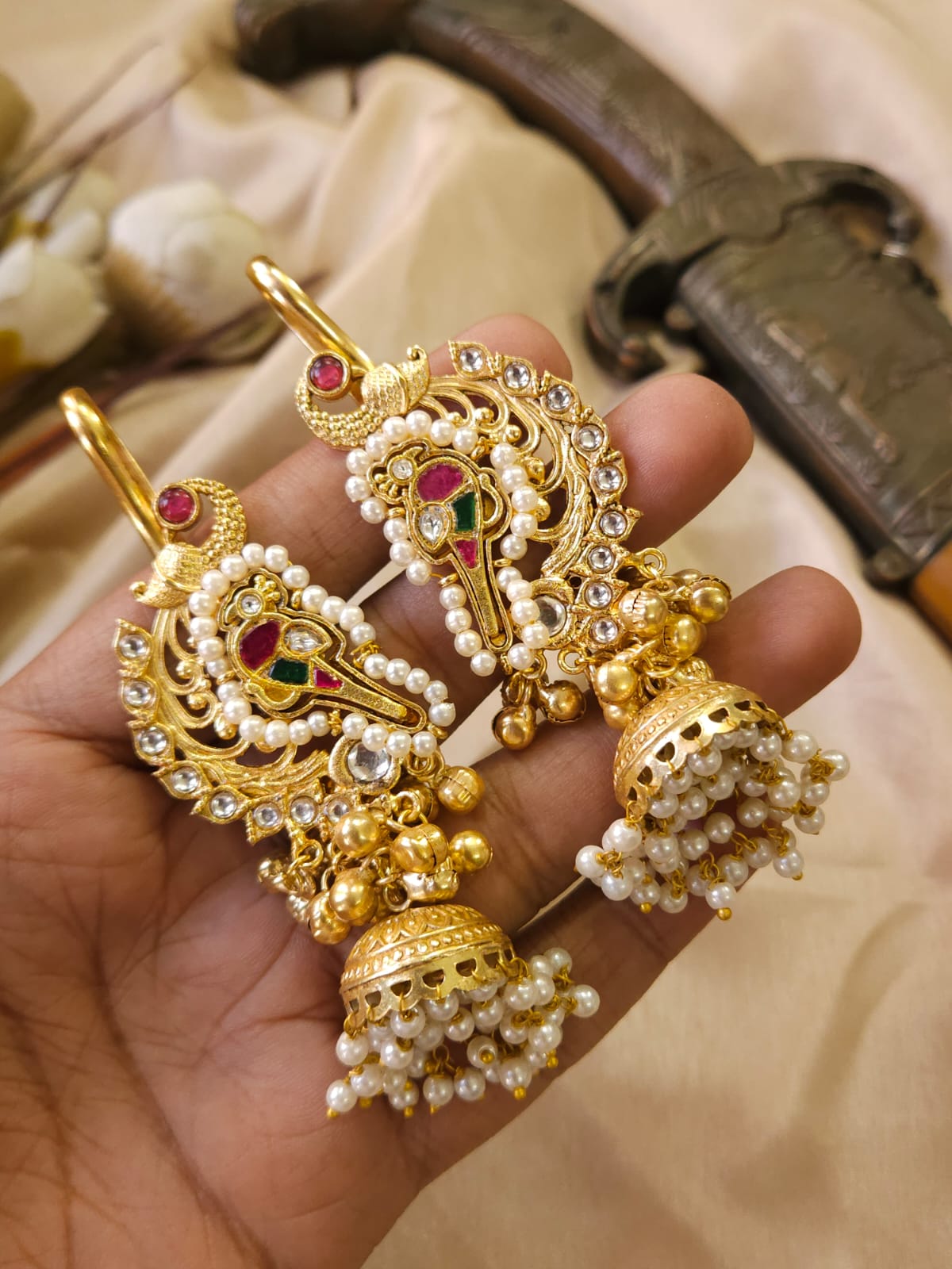 Elevate your ethnic style with these exquisite Chandbali Jhumka Earrings, designed to reflect timeless royal charm. Featuring a stunning blend of ruby-red and emerald-green stones, these earrings are beautifully adorned with intricate kundan work and delicate pearl detailing. The crescent (Chandbali) design flows gracefully into traditional jhumka drops, finished with pearl clusters and golden beads for a rich, festive look.