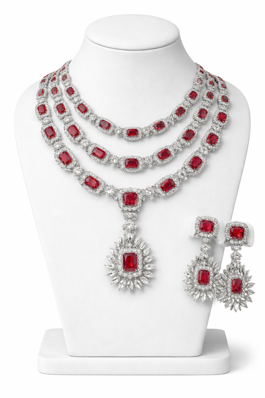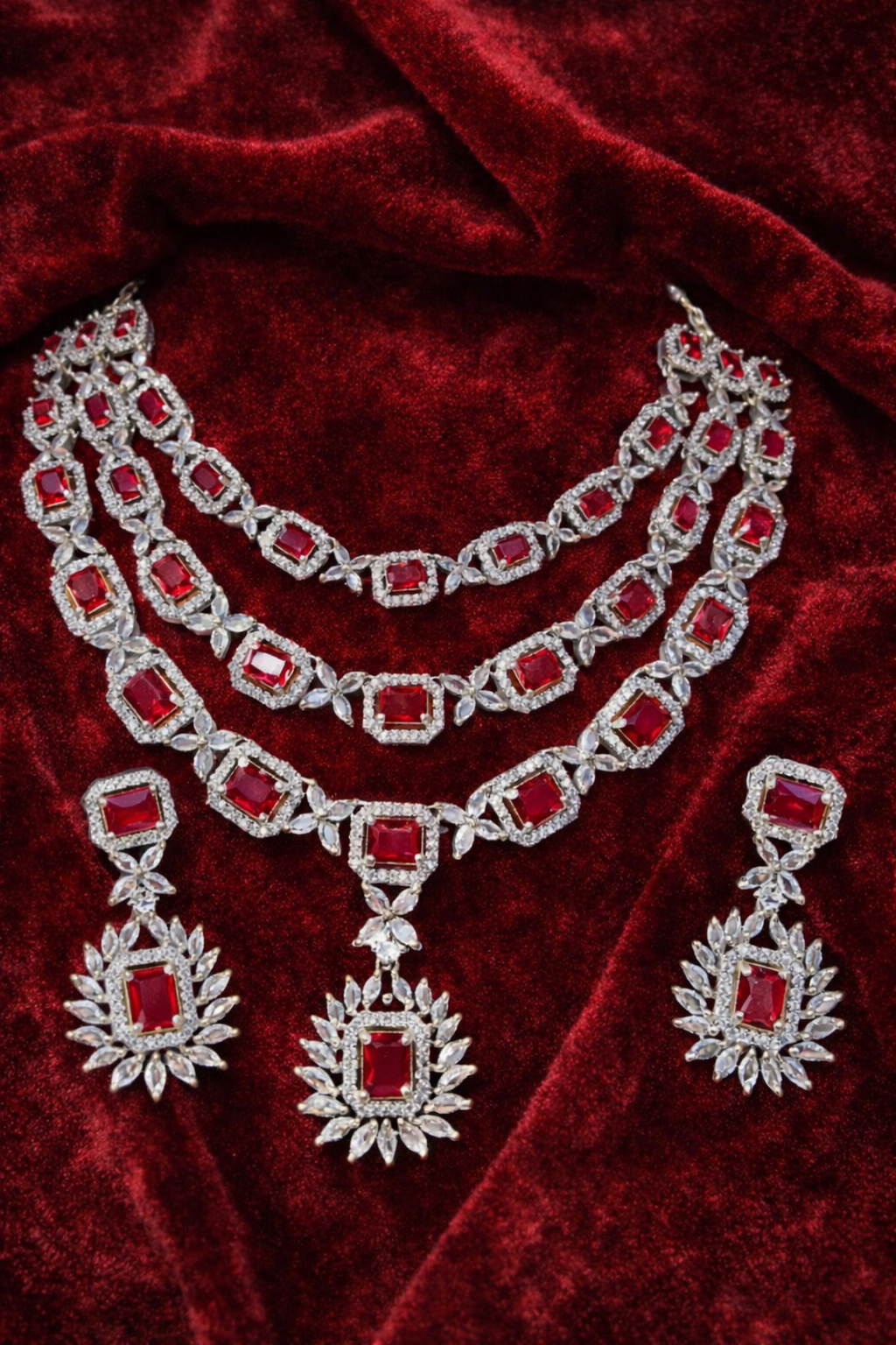 Make a statement of timeless elegance with this luxurious Royal Ruby Cascade Necklace Set, crafted for grand occasions. This exquisite set features a multi-layered necklace adorned with deep red ruby stones set in a dazzling American diamond (CZ) framework, creating a rich and regal look.
