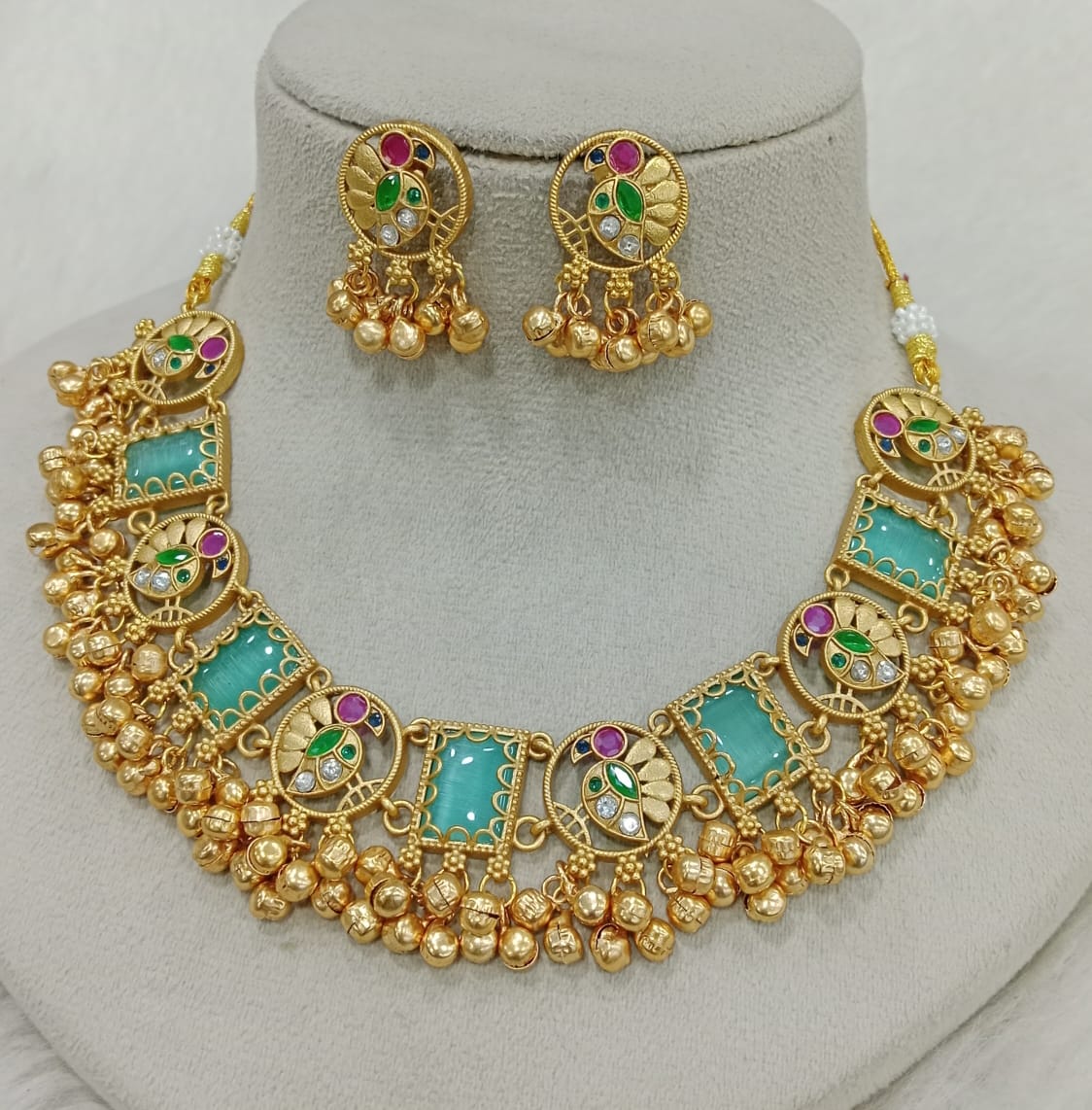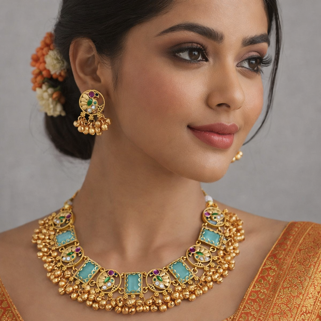 Add a refreshing touch of elegance to your jewellery collection with this Royal Turquoise Kundan Necklace Set. Designed with soothing turquoise blue stone panels, this piece beautifully blends traditional craftsmanship with a modern color palette. The necklace is adorned with intricate circular motifs featuring multicolor Kundan stones in green, red, and white, set in a rich gold-tone finish.