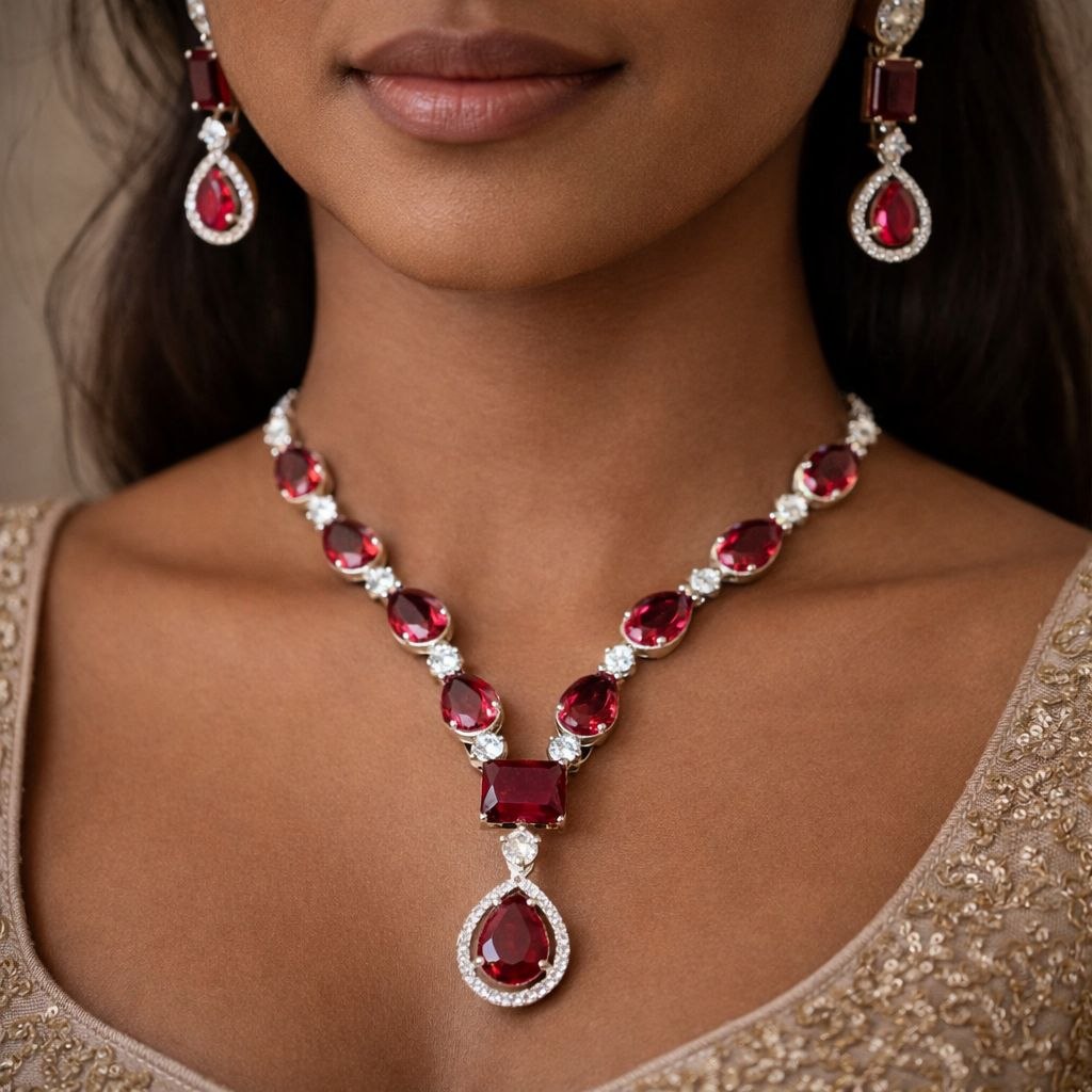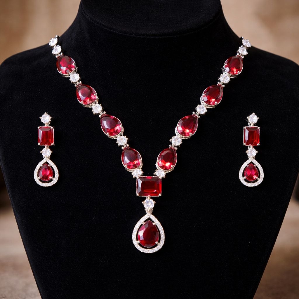 Make a bold and graceful statement with this stunning ruby red crystal necklace and earrings set. Featuring radiant red teardrop stones surrounded by sparkling crystals, this set is designed to capture attention and add a touch of luxury to your look. The centerpiece pendant enhances its elegance, while the matching drop earrings complete the coordinated style.