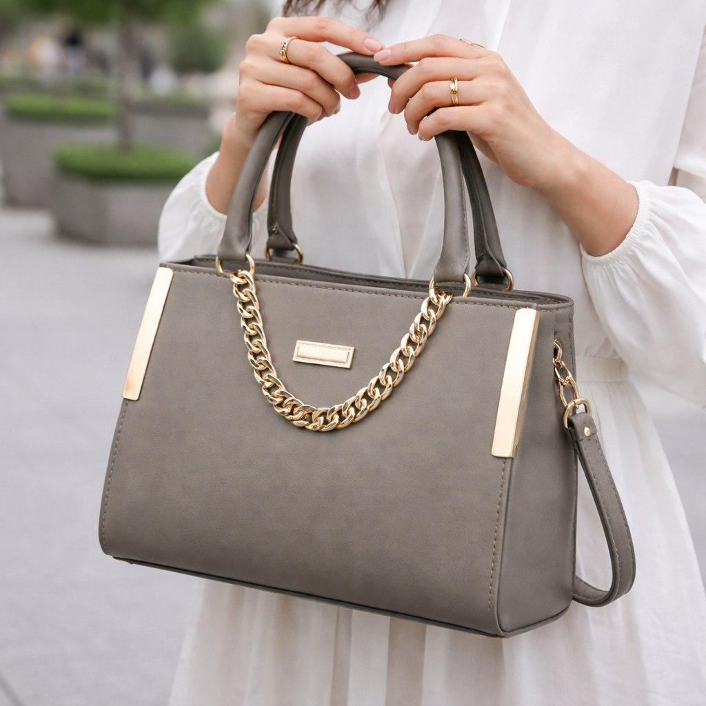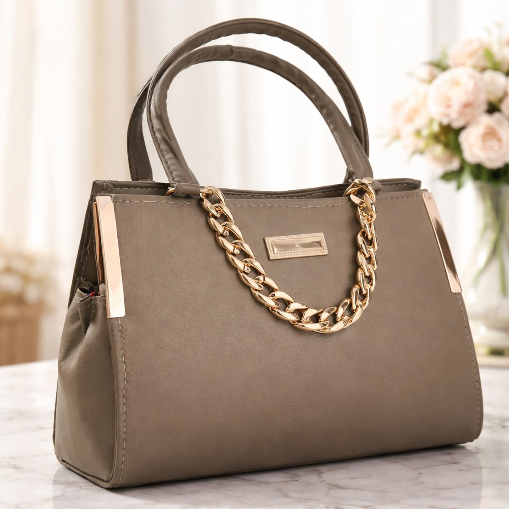Upgrade your style with this sophisticated taupe handbag, designed to offer a perfect balance of elegance and functionality. Featuring a smooth premium finish, this bag stands out with its bold gold-tone chain detail on the front, adding a luxurious touch to its minimal design.