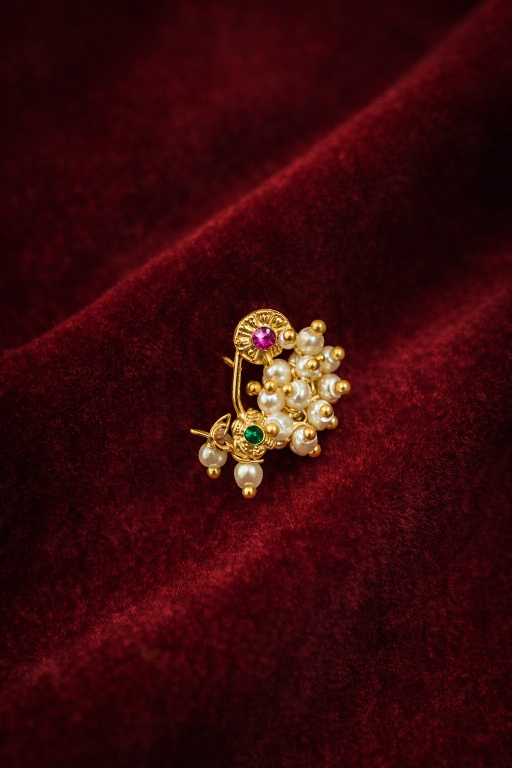 Bring a touch of royal elegance to your look with this exquisite gold-plated nose pin (nath), beautifully adorned with lustrous pearls and vibrant Kundan stones. Designed with a graceful floral-inspired cluster, this piece features delicate pearl drops and a hint of green stone detailing that enhances its traditional charm.