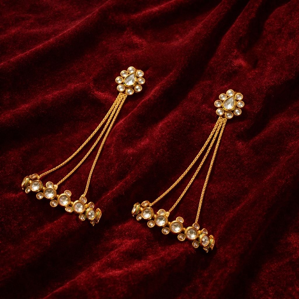 Add a graceful ethnic charm to your look with these beautifully crafted gold-tone floral chain drop earrings. Featuring delicate flower motifs at the top and bottom, connected by elegant cascading chains adorned with tiny bead accents, these earrings create a stunning layered effect that enhances your overall style.
