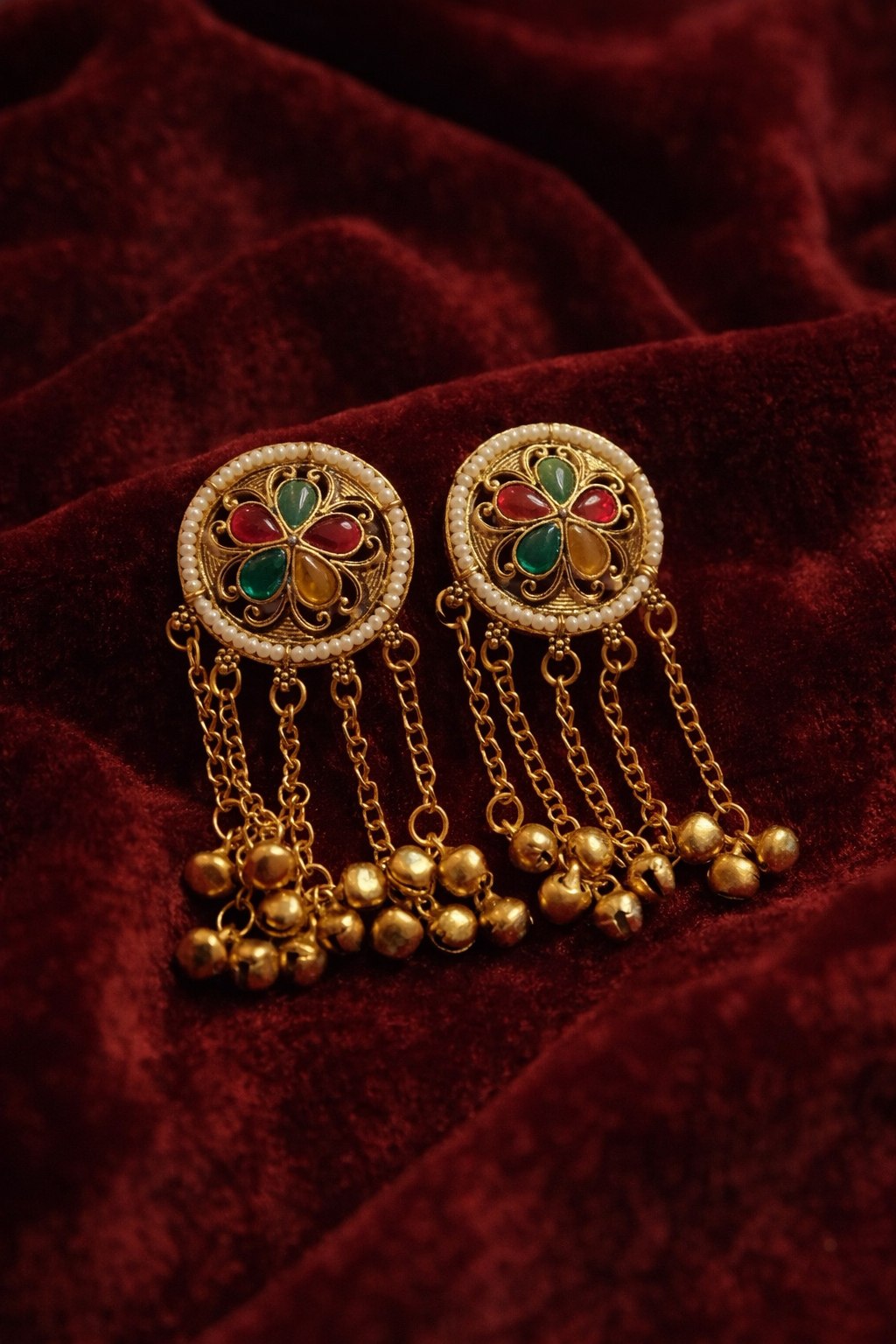 Traditional Multicolor Stone Floral Dangler Earrings with Ghungroo