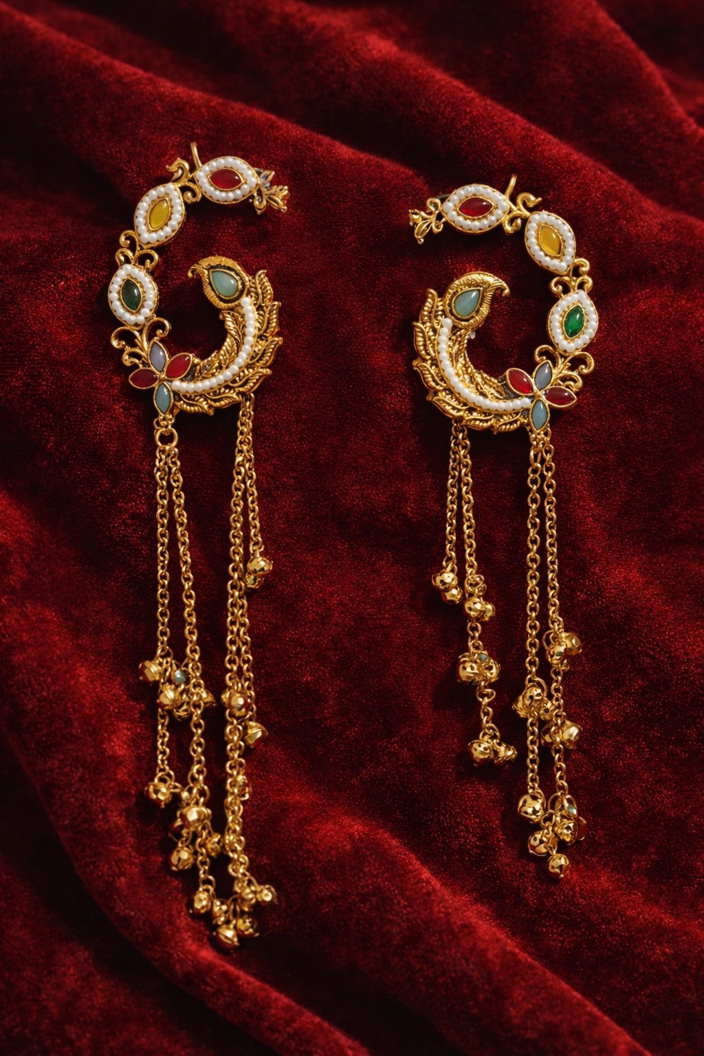 Traditional Peacock Multicolor Stone Long Dangler Earrings with Ghungroo Chains