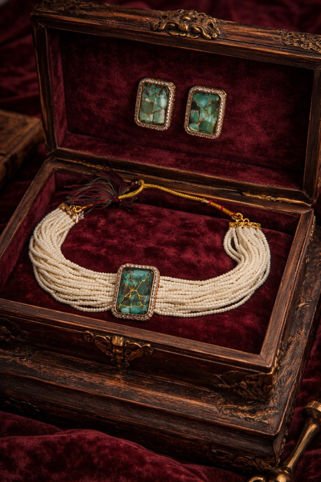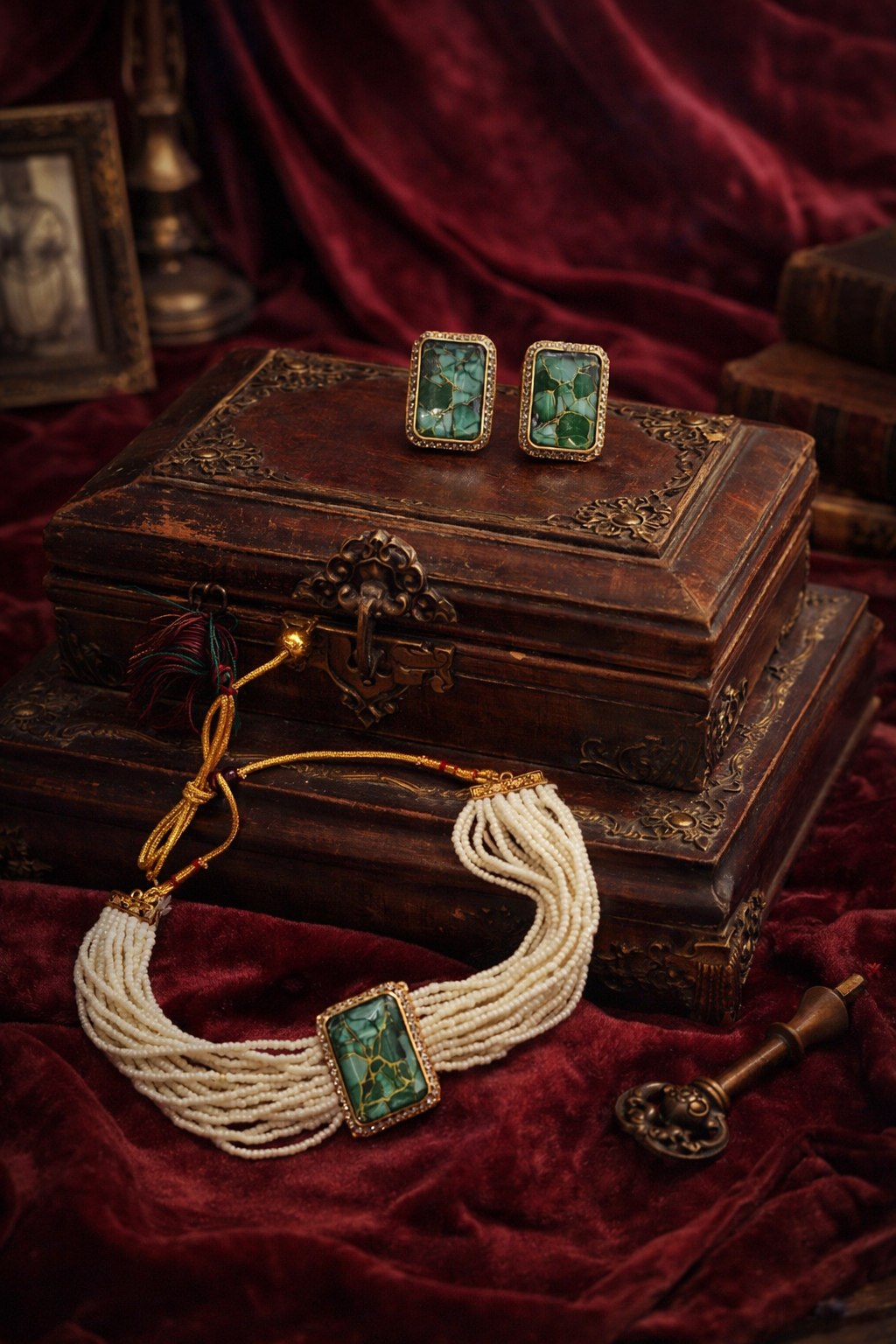 Elevate your elegance with this exquisite vintage-inspired jewelry set, featuring a beautifully crafted multi-strand pearl necklace paired with matching stud earrings. The centerpiece showcases a striking rectangular emerald-toned mosaic stone with delicate gold veining, encased in a finely detailed gold frame.